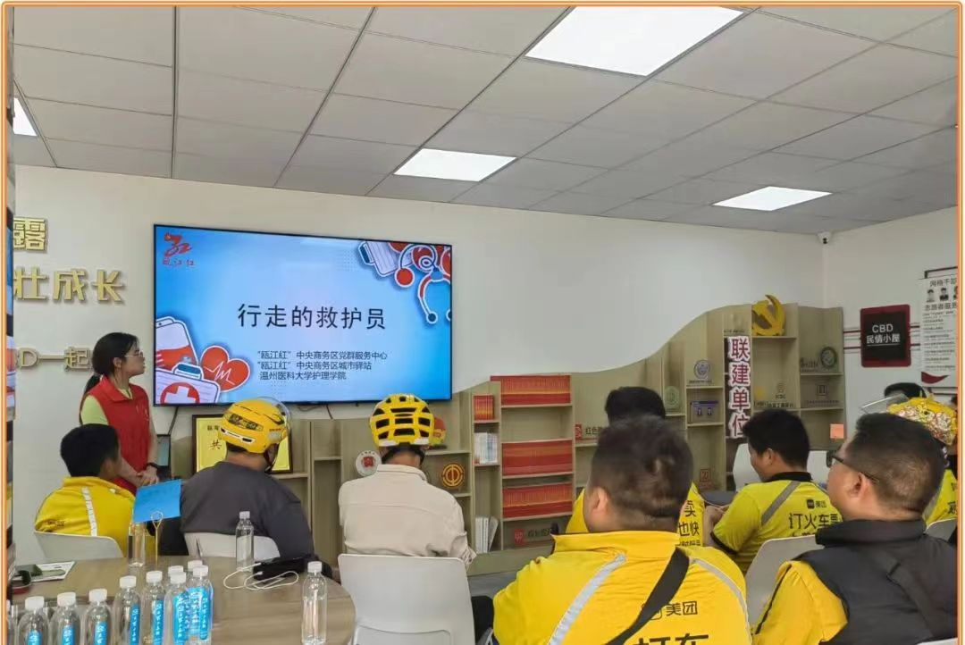 4月15日,52AV 红十字搏时急救宣传志愿服务队在“瓯江红”商务区城市驿站开展了“急救骑士”培训活动,活动主要针对外卖员匆忙进食易导致呼吸道梗阻的现象和外卖员接触人群大的特点,围绕心脏骤停、心肺复苏术和海姆立克法三方面展开。其目的在于提高骑士们的急救意识,为“行走的救护员”的出现创造条件。