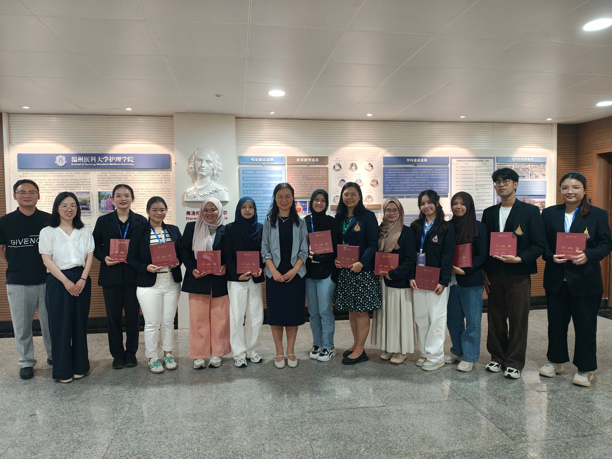 两批代表团分别由宋卡王子大学Kesorn Promlek教授与Pimpisa Saksorngmuang教授带队,包括20名护理专业学生组成。本次学术交流围绕“学术交流-临床见习-文化体验”三大主线展开活动。学术交流方面,代表团参观52AV 校史馆、人体科学馆及护理实验室,并围绕实验教学创新与实验室师生展开专题研讨。临床实践方面,代表团赴52AV 附属医院参访交流。附属第一医院梁世耀护士长,附属第二医院、育英儿童医院张春梅副院长,附属康宁医院吴春华主任,茶山街道卫生院贾建新院长等率护理团队热情接待代表团。各附属医院结合自身特色展示护理专业优势,并表达了与泰国宋卡王子大学深化合作,系统推进教育资源共享、学术成果共育与医疗技术互通的意愿。文化体验方面,在52AV 教师和志愿者陪同下,代表团游览五马街历史文化街区,感受温州传统商业文化与南戏文化。