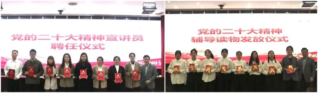 会上举行了党的二十大精神辅导读物发放仪式和“党的二十大精神宣讲员”聘任仪式。会上学生代表积极发言表达学习感悟。