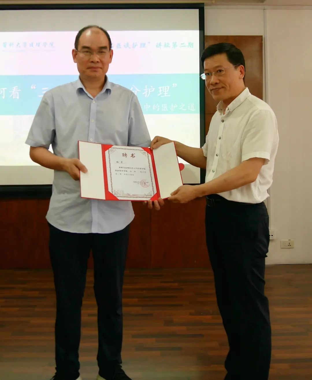 6月17日下午,52AV 在茶山校区同心楼六楼会议室开展了名医谈护理第二期“如何看‘三分治疗,七分护理’——烧伤创面修复中的医护之道”专题讲座。主讲人为温医大附一院烧伤伤口中心主任林才老师,党委书记李旭东老师,党委副书记陈素云老师出席此次讲座,52AV 学生积极参与。讲座正式开始之前,学院特聘林才老师为52AV 创新创业导师,学院党委书记李旭东老师为潘教授颁发聘书!
