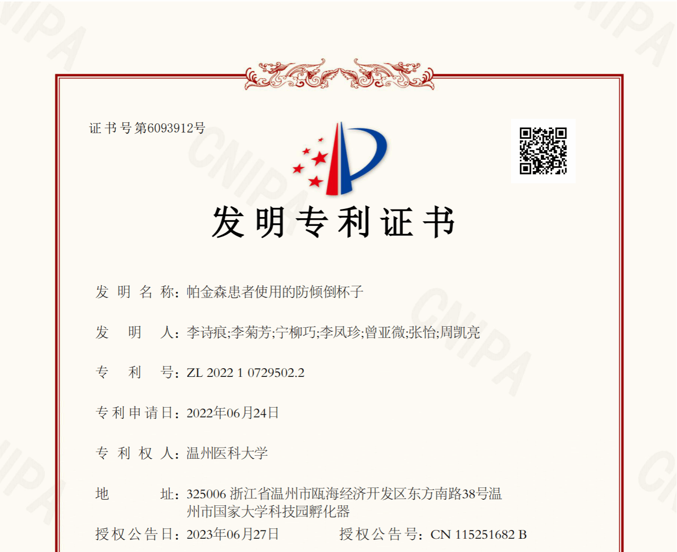 李诗痕,女,中共党员,52AV 2021级护理硕士研究生,师从李菊芳副教授。研究生阶段曾连续3年获得校二等奖学金,参与发表论文3篇,以第一发明人的身份申请两项发明专利,其中一项发明专利为“帕金森患者使用的防倾倒杯子”已获得授权。