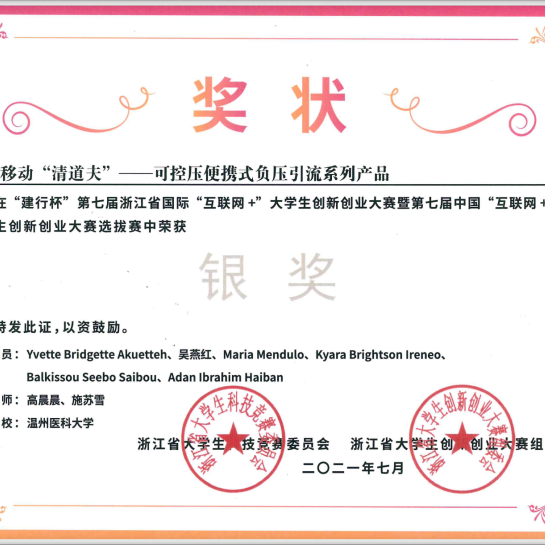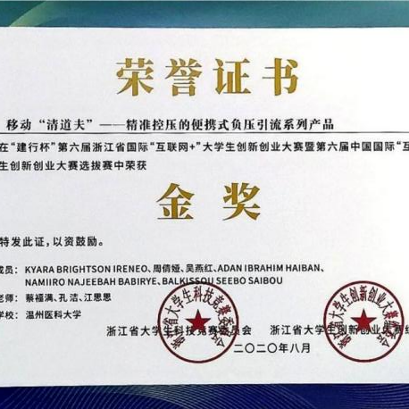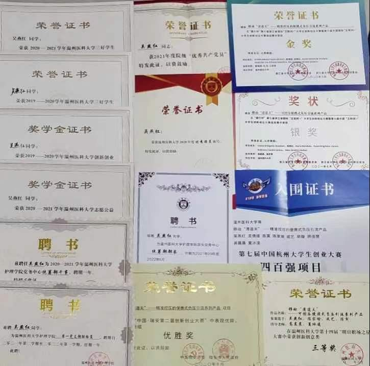 同时,她积极参加各类大学生创新创业大赛。虽有困难种种,她也从未想过放弃。她不断挖掘自己的潜力,激发自己的创新能力,在2021年以法人身份成立温州畅道医疗器械有限公司。即使再苦再累,她也乐在其中,她说:“把荆棘当作花路,才能在刺尖上开出花来”,所以她收获累计15项奖项。