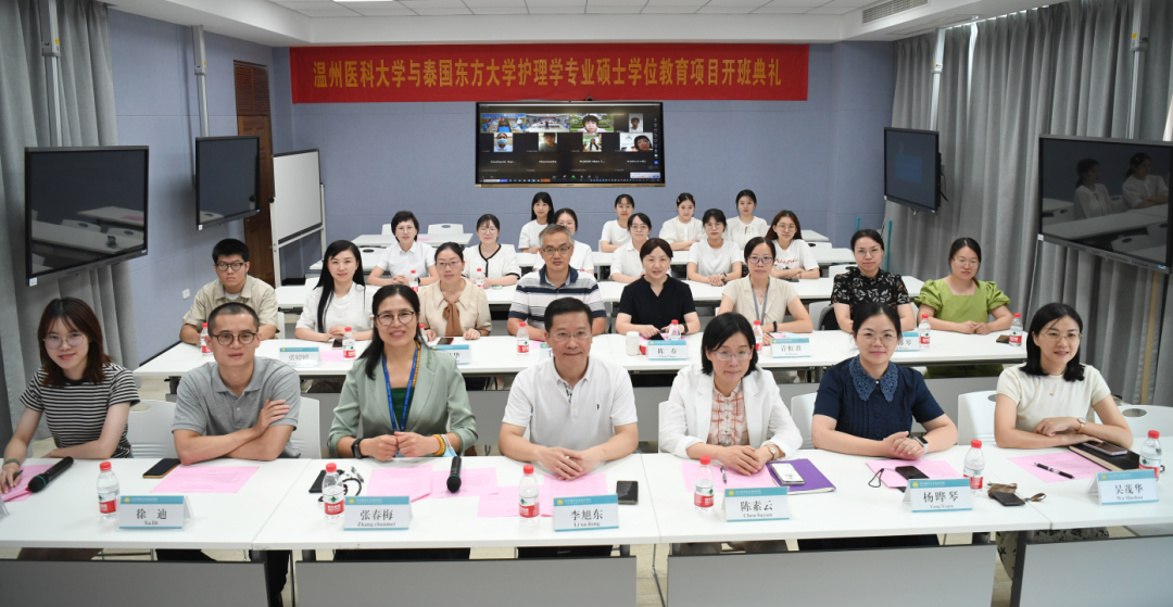 9月6日下午,52AV 与泰国东方大学合作举办的第四届护理学专业硕士学位教育项目开班典礼在学校6A104会议室举行。研究生院培养办主任吴茂华、国际合作交流处对外合作交流科副科长徐迪受邀出席,52AV 党委书记李旭东、党委副书记陈素云、副院长张春梅、杨晔琴,项目中方教师毛广运、陈春、许虹波及相关科室人员现场参加,共有18名新生分别以线上、线下形式参加。泰国东方大学52AV 副院长、中泰项目泰方负责人Chintana Wacharasin博士、泰方教师在线参加。典礼由张春梅副院长主持。