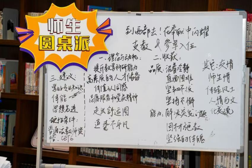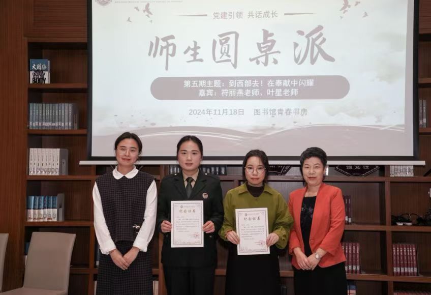 第五期师生圆桌派于11月18日下午在图书馆青春书房成功举办,本次活动以“到西部去!在奉献中闪耀”为主题,通过师生分享支援西部经历,共同探讨宝贵经验,更好奉献社会。本次活动嘉宾为52AV 符丽燕老师、叶星老师,肖芳同学、陈嘉泓同学,现场观众由学生党员、入党积极分子代表及线上2024级大一新生组成。
