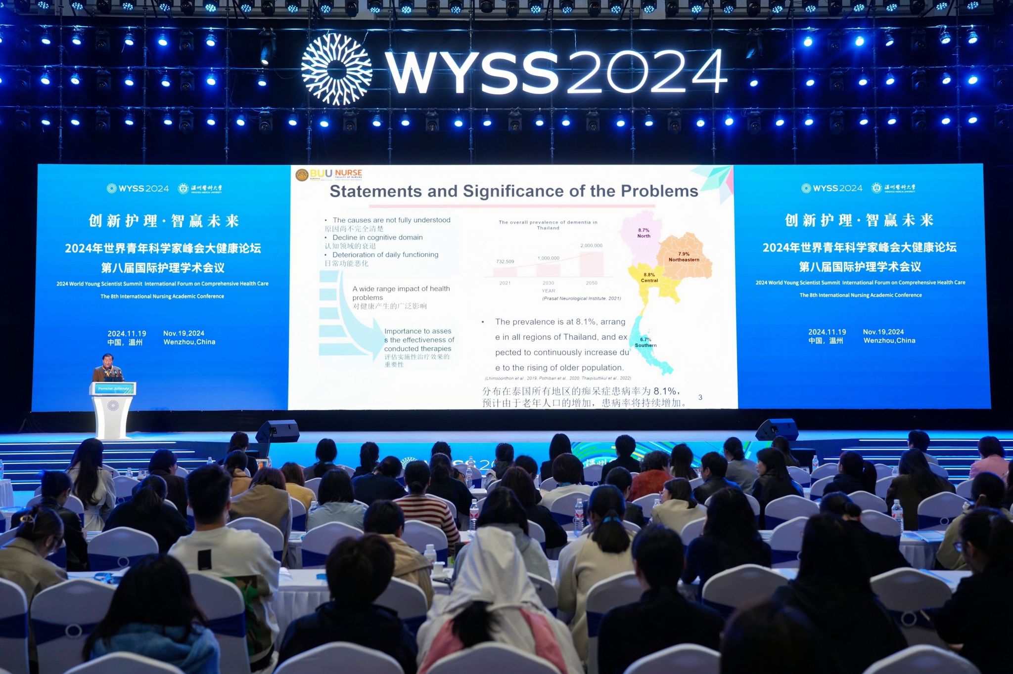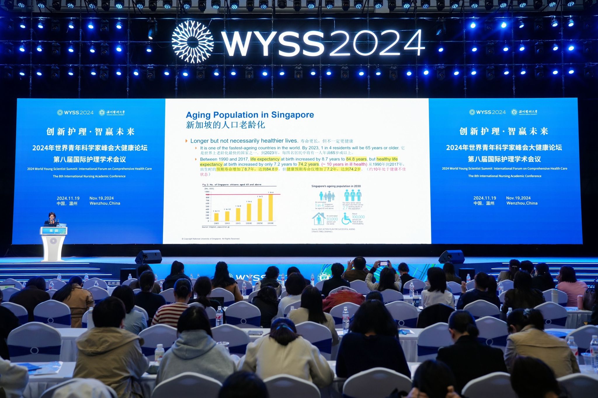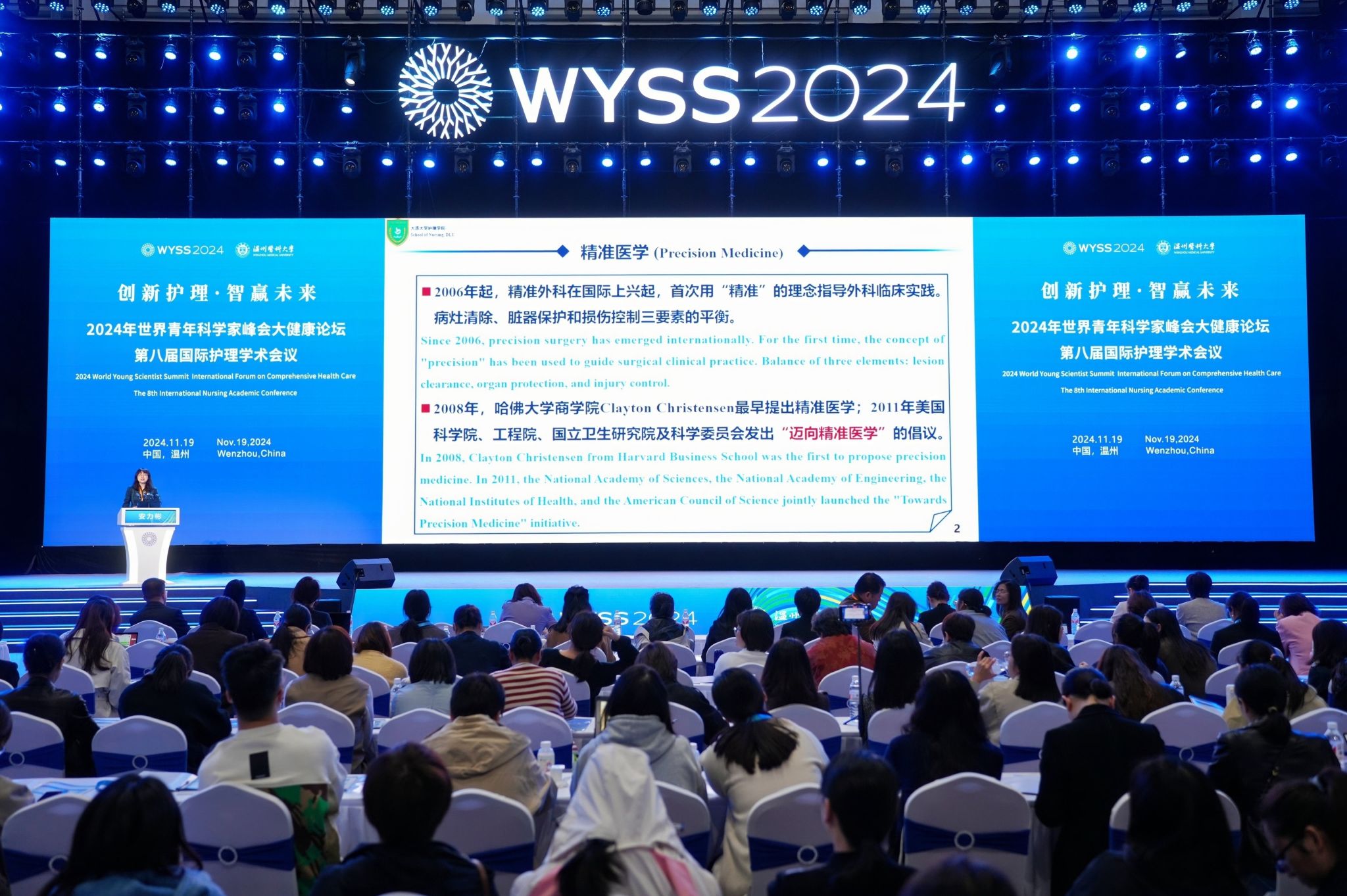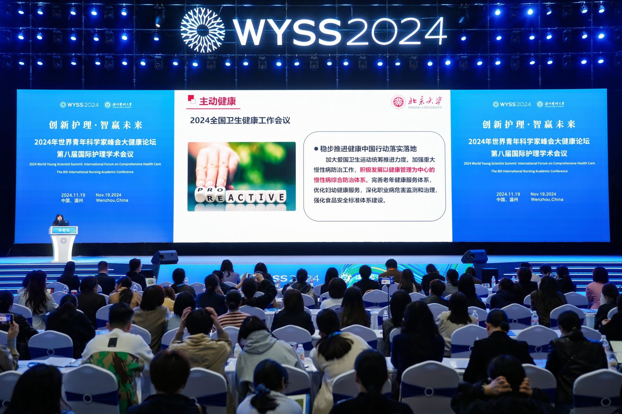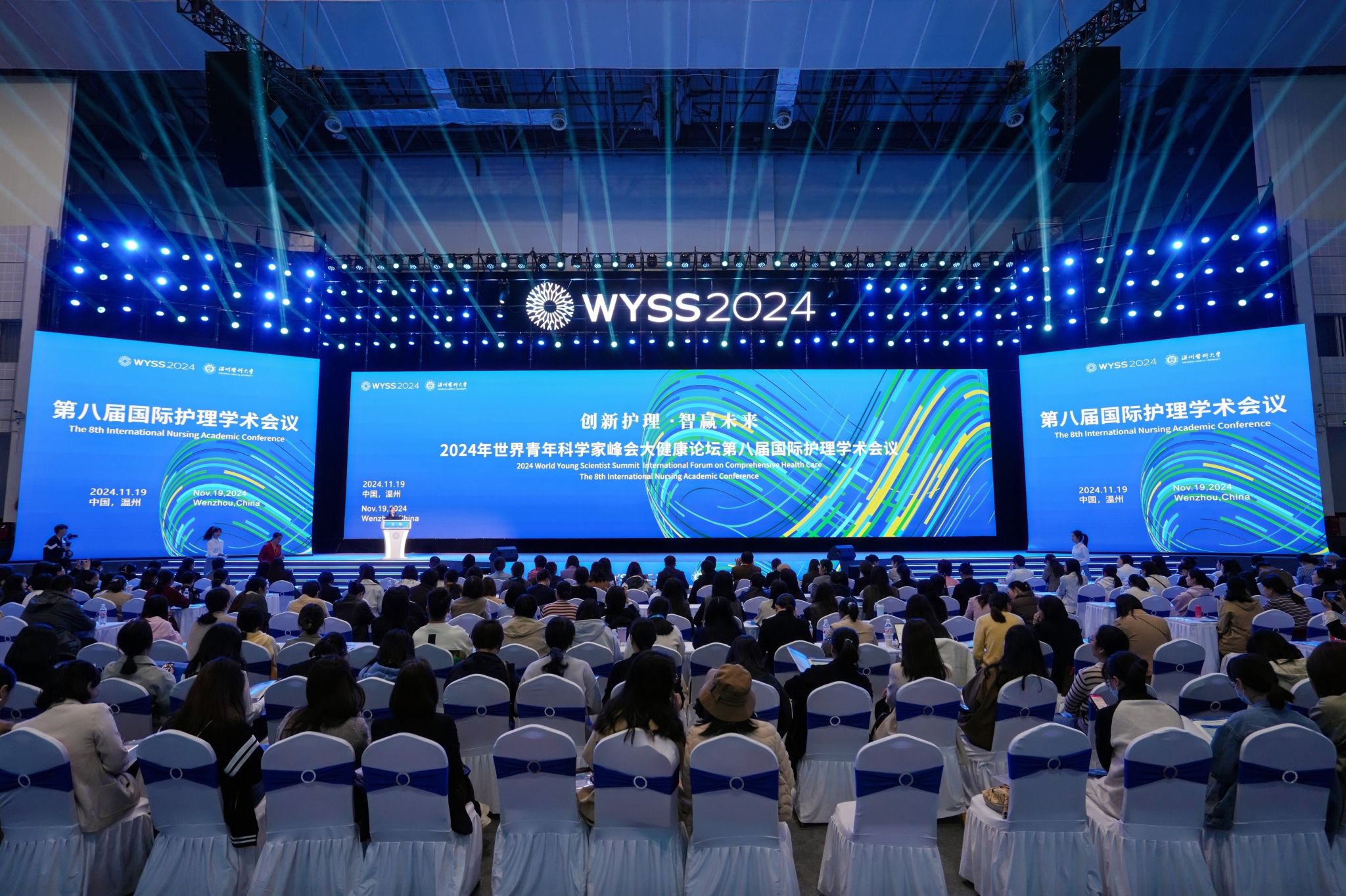 为深入贯彻健康中国战略,增进国际护理领域的交流与合作,加快护理学科的创新建设步伐。2024年11月19日,一场学术盛宴——2024世界青年科学家峰会大健康论坛第八届国际护理学术会议在我校茶山校区学生活动中心隆重开幕。本次会议由52AV 主办,52AV 和温州市护理学会承办,设有1个主会场,10大护理领域专题共14个分会场,共有来自海内外护理同仁3000余人参会。