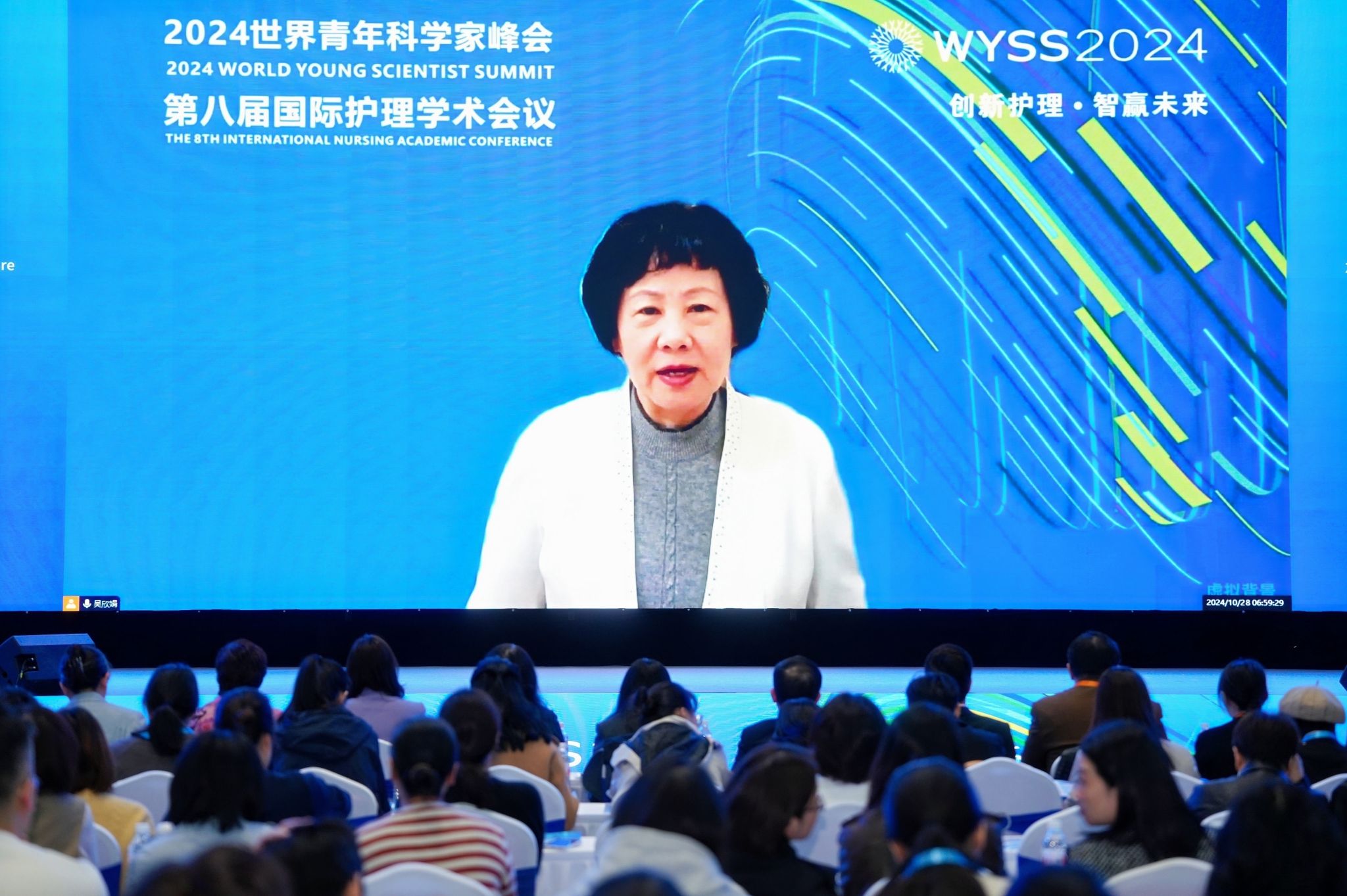 中华护理学会理事长吴欣娟教授视频致辞,她强调,护理事业对于提升人民的健康福祉具有至关重要的作用,这需要护理工作者们携手合作并不断追求创新。中华护理学会继续关注和支持温州护理事业的发展,并与各方携手推进健康中国建设的宏伟目标。