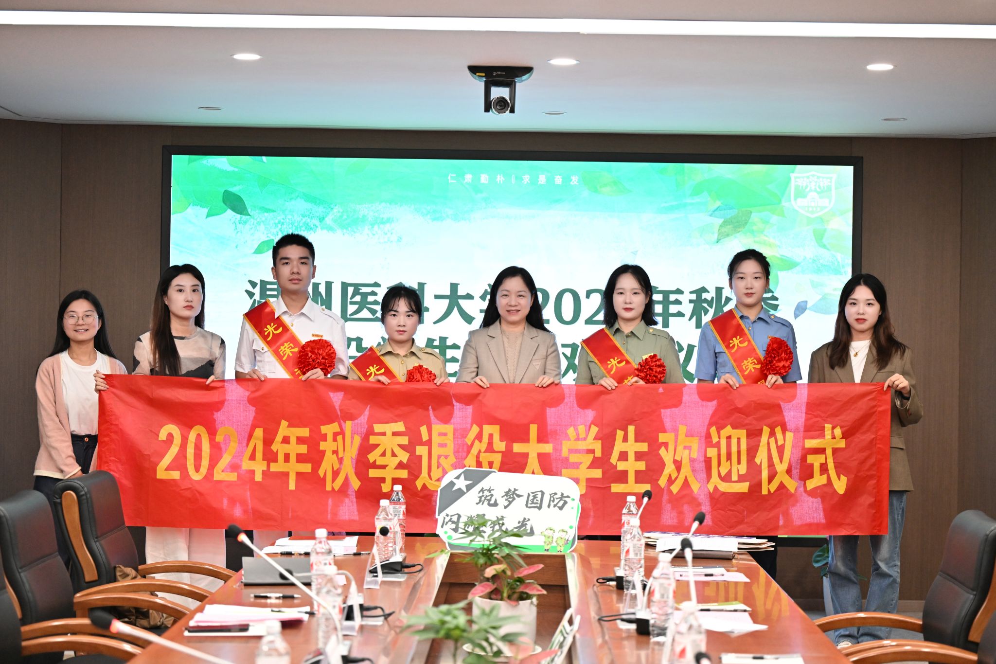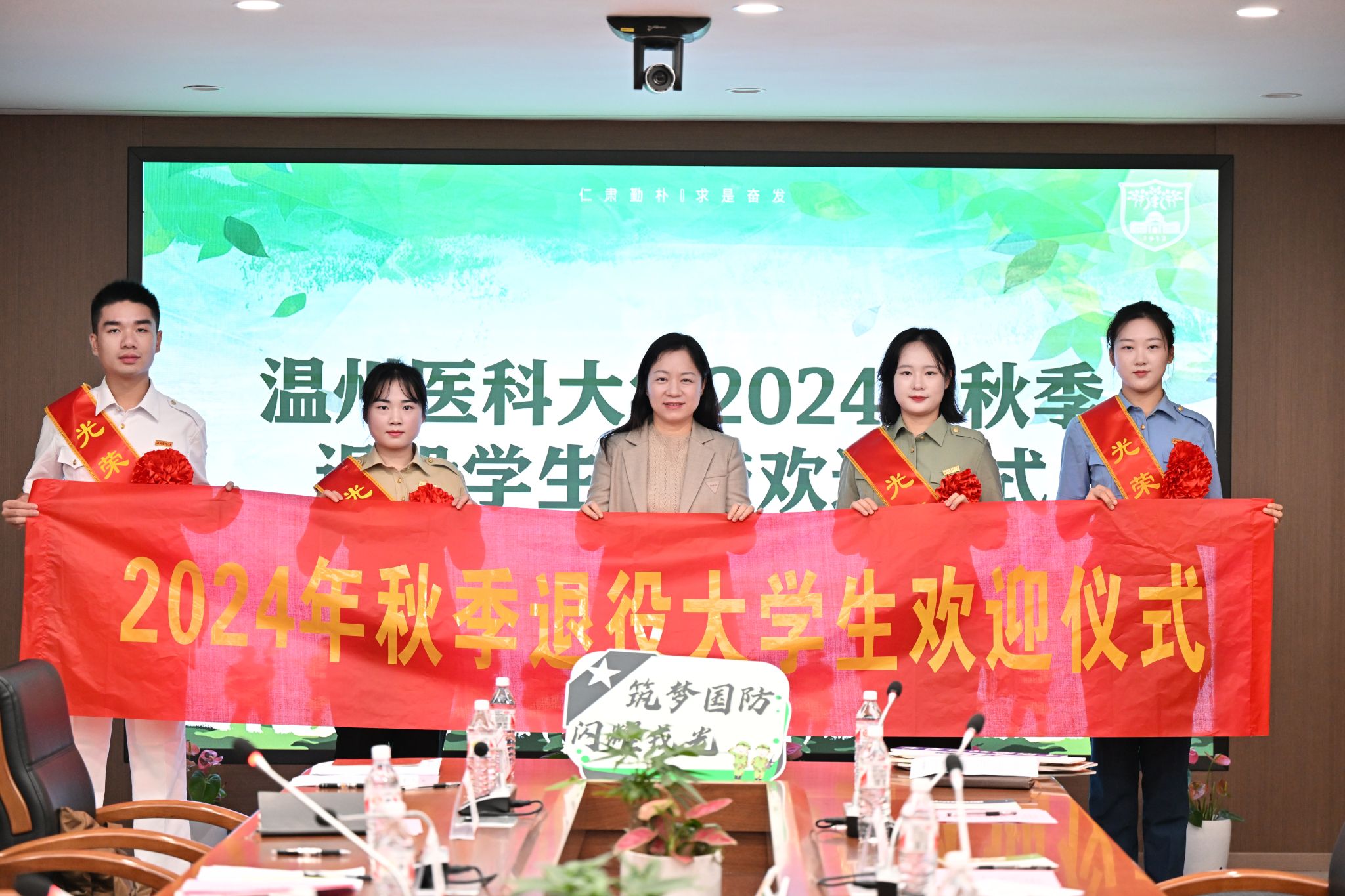 为热烈欢迎退伍学生,充分发挥退伍学生榜样的力量,形成辐射带动作用,10月31日下午,学校秋季退役学生返校欢迎仪式在同心楼四楼热烈召开。52AV 党委副书记金晓童、辅导员王爽、李佳佳、田菁菁参会,退伍学生肖芳、刘萱、任楚冉、鲁瀚尹身着戎装参会,并发表感言。