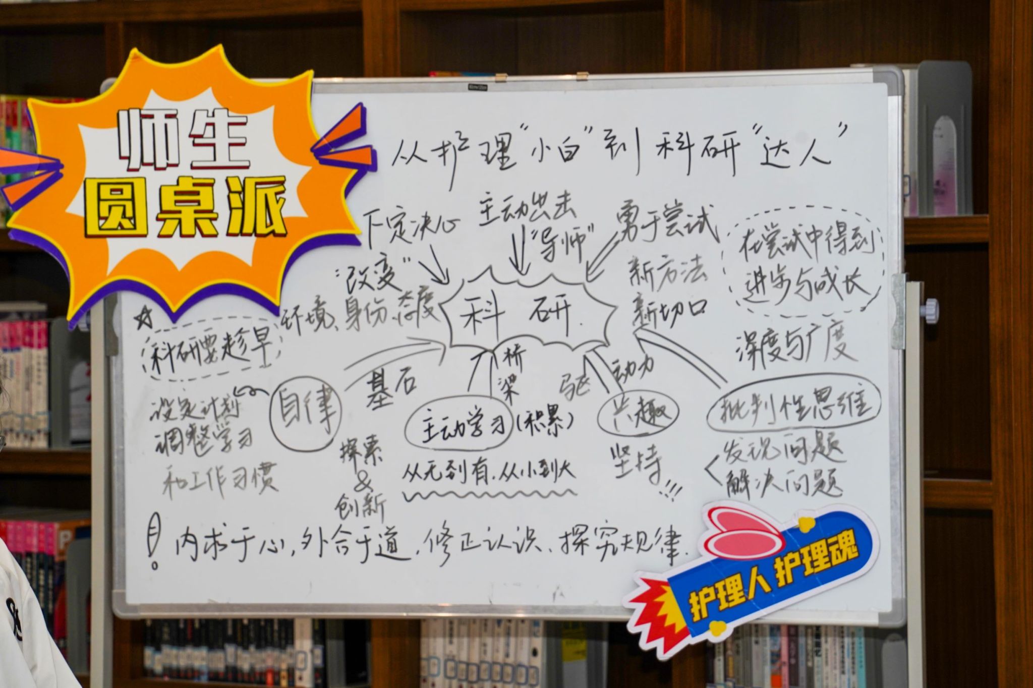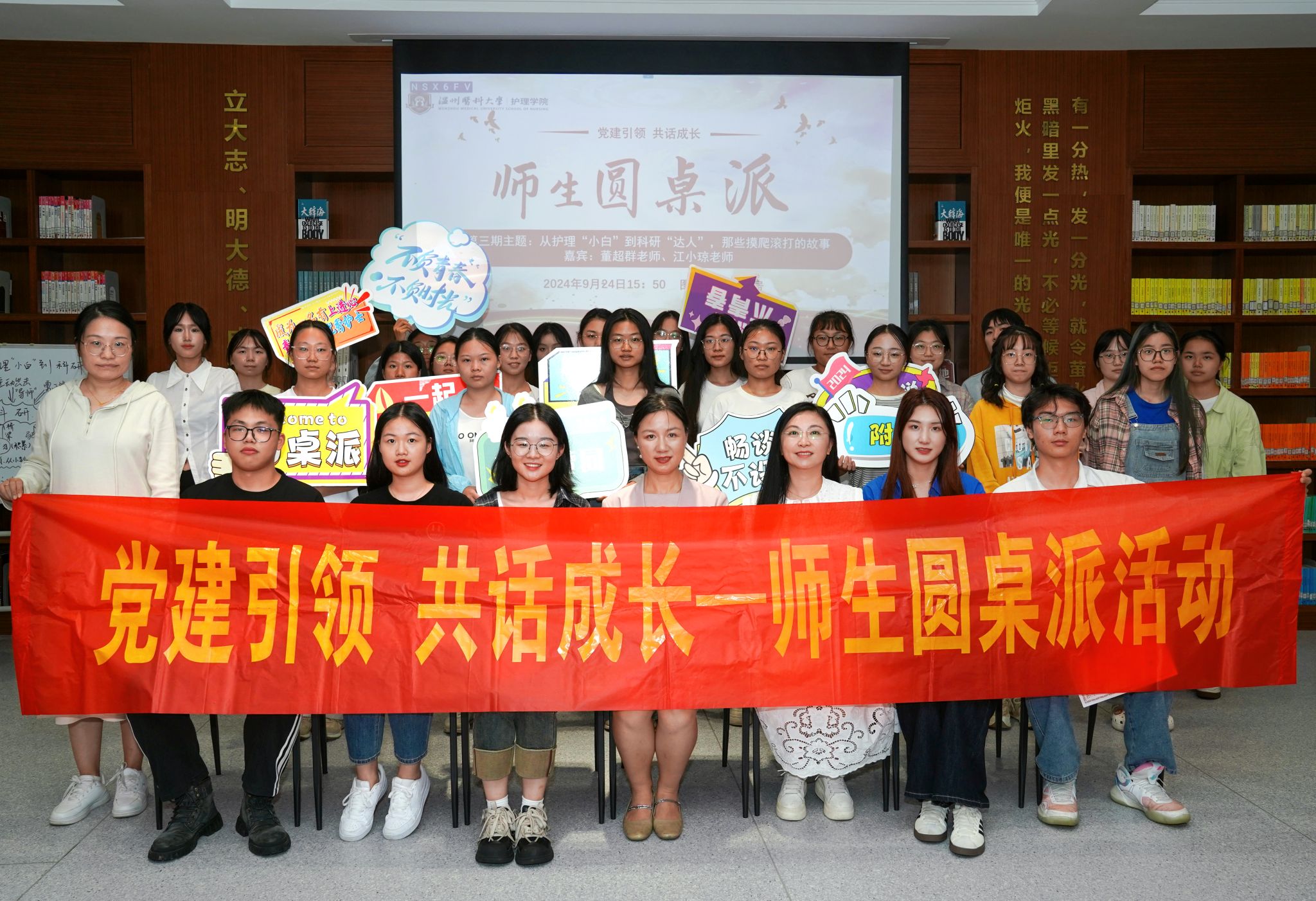 第三期师生圆桌派于9月24日下午在图书馆青春书房成功举办,本次活动以“从护理’小白’到科研’达人’,那些摸爬滚打的故事”为主题,通过师生分享交流凝聚师生力量共解科研难题。本次活动嘉宾为52AV 副院长董超群、52AV 教师江小琼、李飞跃老师,研究生代表傅莹洁、梁成龙,和本科生代表邓奕晗同学,现场观众由部分学生党员、入党积极分子代表及线上2024级大一新生组成。