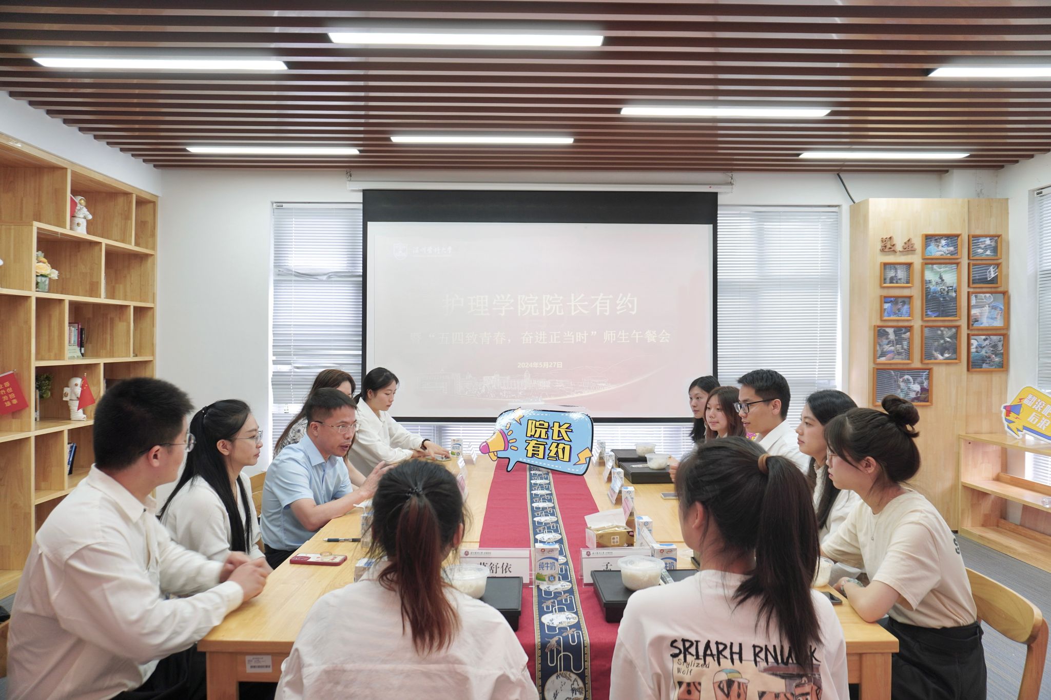 为深入落实立德树人根本任务,实施护理精英教育,发挥示范引领作用,着力培养面向中国式现代化的卓越护生队伍,5月27日中午,52AV 在我家书房举行院长有约暨“倾听‘生’音,卓越领航”师生午餐会。学院院长蔡福满、党委副书记金晓童、学工办主任张婧婧、辅导员李飞跃、王爽、李佳佳等与学院卓越护生代表倾心交流,共话成长!