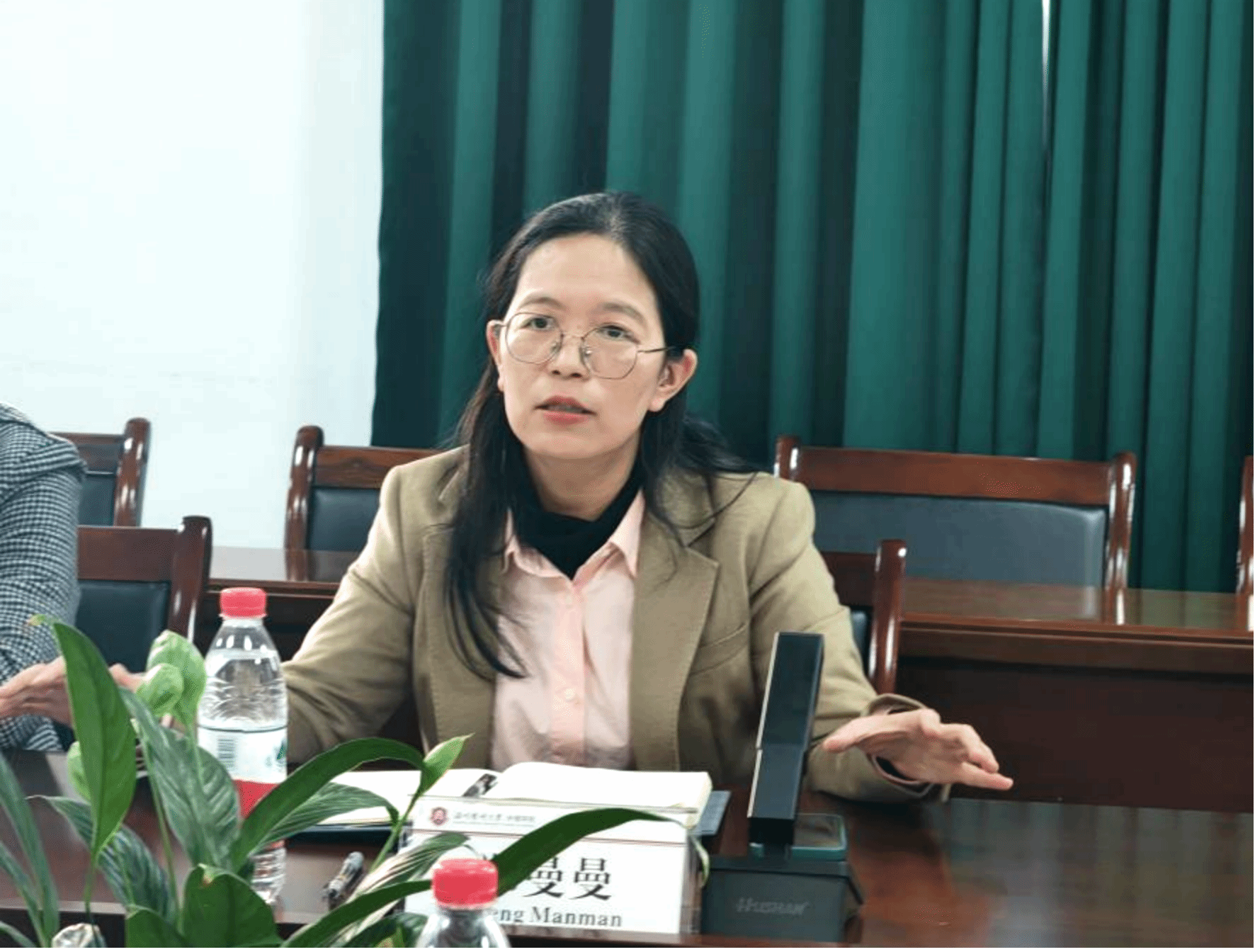 首先,学院院长蔡福满对郑曼曼书记一行的到来表示热烈的欢迎,向党委研工部(研究生院)对52AV 一直以来的支持和指导表示感谢。他表示,学院接下来会在培养博士研究生、提升导师水平、优化专硕培养方案和规范化管理上下功夫。董超群副院长从学院研究生教育概况、满意度提升、学位论文质量、培养基地建设等方面作汇报。