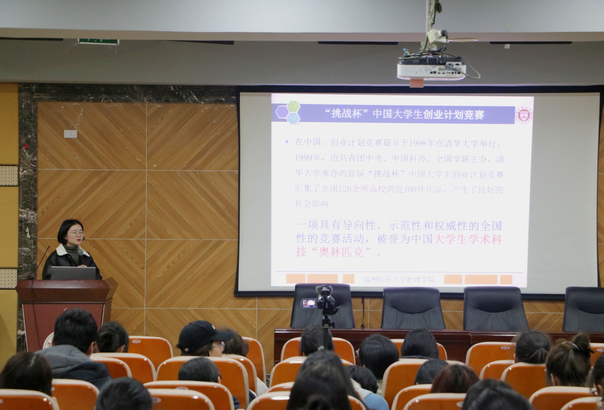 江小琼老师围绕挑战杯&互联网+的赛事规则及项目申报做了分享交流。她以参与指导的项目为例进行展示讲解,向同学们详细介绍了赛事细则、选题策略、项目设计及竞赛注意事项等要点,为同学们如何申报项目提出了指导性意见。