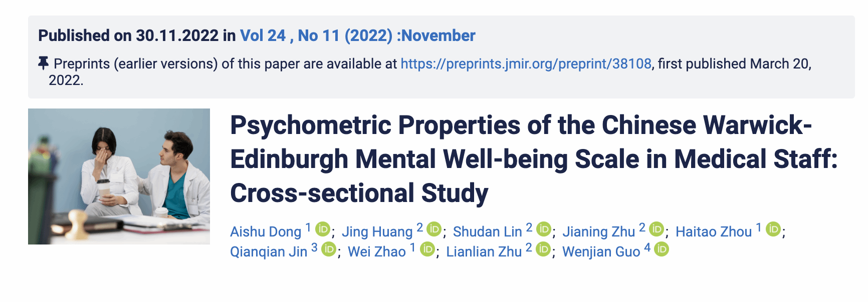 心理健康一直是公共卫生领域备受关注的一个问题。医务人员的心理健康状态不仅直接影响其专业素养和工作效率,还会对医疗质量、护理质量和整体生活质量产生至关重要的影响。在这个背景下,董爱淑导师团队引入了华威克-爱丁堡心理幸福感量表,并在中国医务人员中进行了应用研究。本研究调查了中国6家医疗单位医护人员的心理幸福感水平,使用经典测量分析方法来评估华威克-爱丁堡心理幸福感量表在中国医务人员中的信度和效度;同时使用项目反应理论来评估华威克-爱丁堡心理幸福感量表各个测试题目的质量和效度,并确定测试工具的整体测量准确性。研究结果显示中文版华威克-爱丁堡心理幸福感量表具有较好的心理测量学特性,可以有效测量医护人员心理幸福感水平。这不仅是对华威克-爱丁堡心理幸福感量表在中国的应用研究,也是对医务人员心理健康问题的重视和关注,对促进医疗卫生事业的可持续发展具有重要意义。