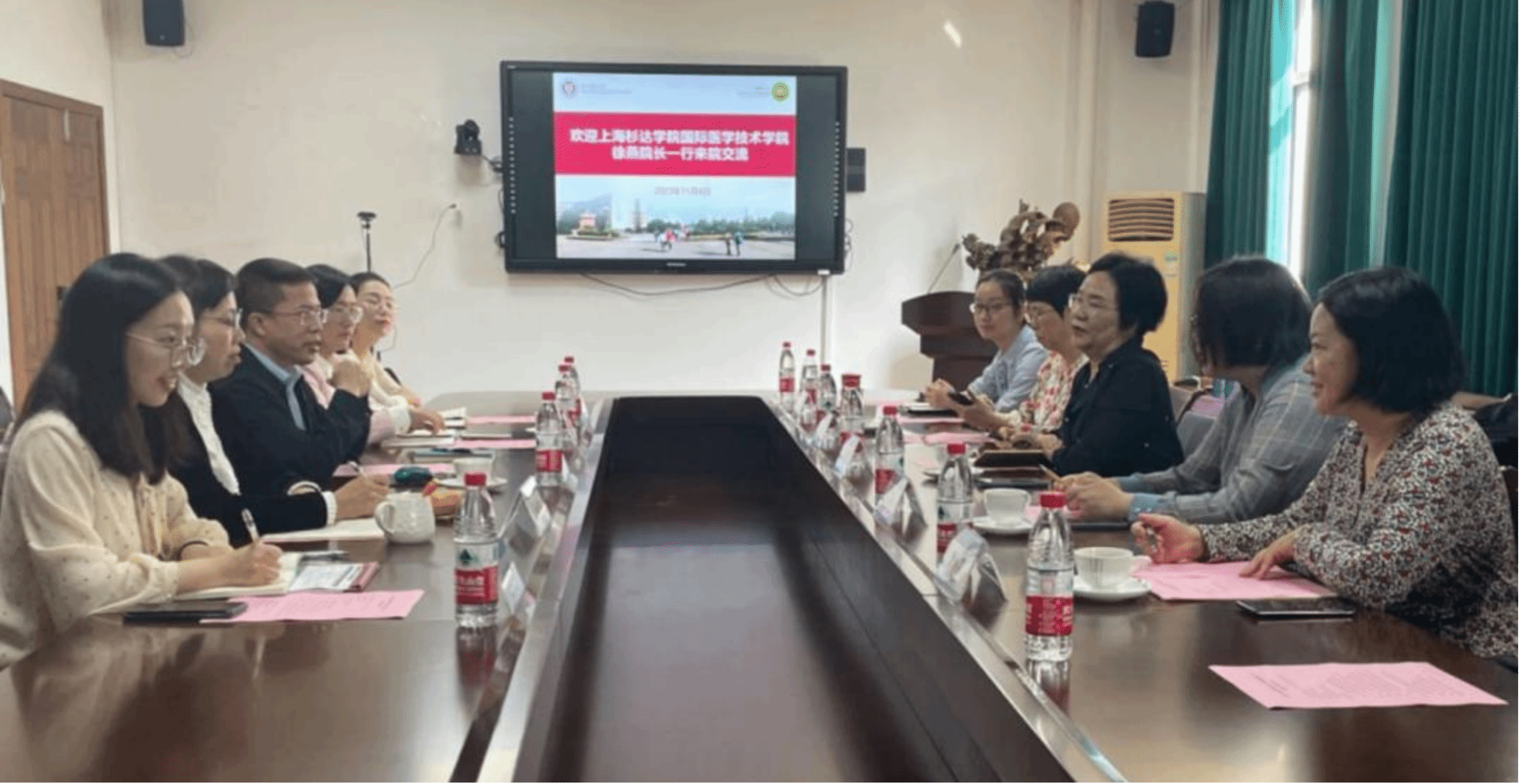 11月6日,上海杉达学院国际医学技术学院院长徐燕、党总支书记丁俭、 副院长张静、护理系主任岳立萍、护理系副主任胡菁来院访问交流。52AV 院长蔡福满、党委副书记陈素云、教学办主任孙海琴、外科教研室副主任江思思等在学院会议室热情接待了客人。