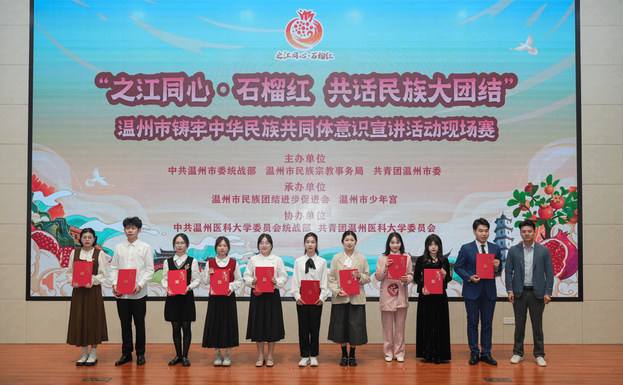 为贯彻落实党的二十大精神,纪念“八八战略”实施20周年,在青少年群体中广泛开展铸牢中华民族共同体意识教育,2023年11月3日、4日,由中共温州市委统战部、温州市民族宗教事务局、共青团温州市委联合主办,温州市民族团结进步促进会、温州市少年宫联合承办的“之江同心·石榴红 共话民族大团结”温州市铸牢中华民族共同体意识宣讲活动现场赛在温州市少年宫和52AV 顺利举行。52AV 学子2023级护本3班黄王硕同学以《民族团结一家亲 坚定不移跟党走》荣获三等奖。