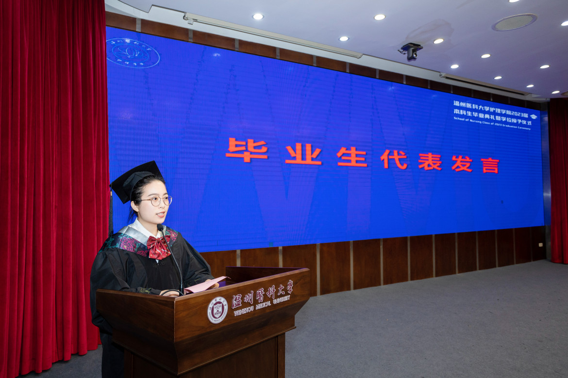 教师代表许虹波老师寄语同学们要树立终身学习的理念,学着前辈的样子,始终坚守初心不改,脚踏实地,在护理道路上无畏前行。本专科学生代表陈聪、许海钰回顾了四年在温医大求学的青春点滴,并表示今后将承载着老师们的殷切希望,继续秉持52AV “护之以技,理之以道”精神,努力成为一名优秀的护理人。