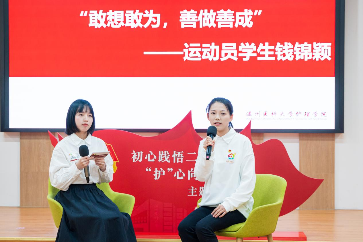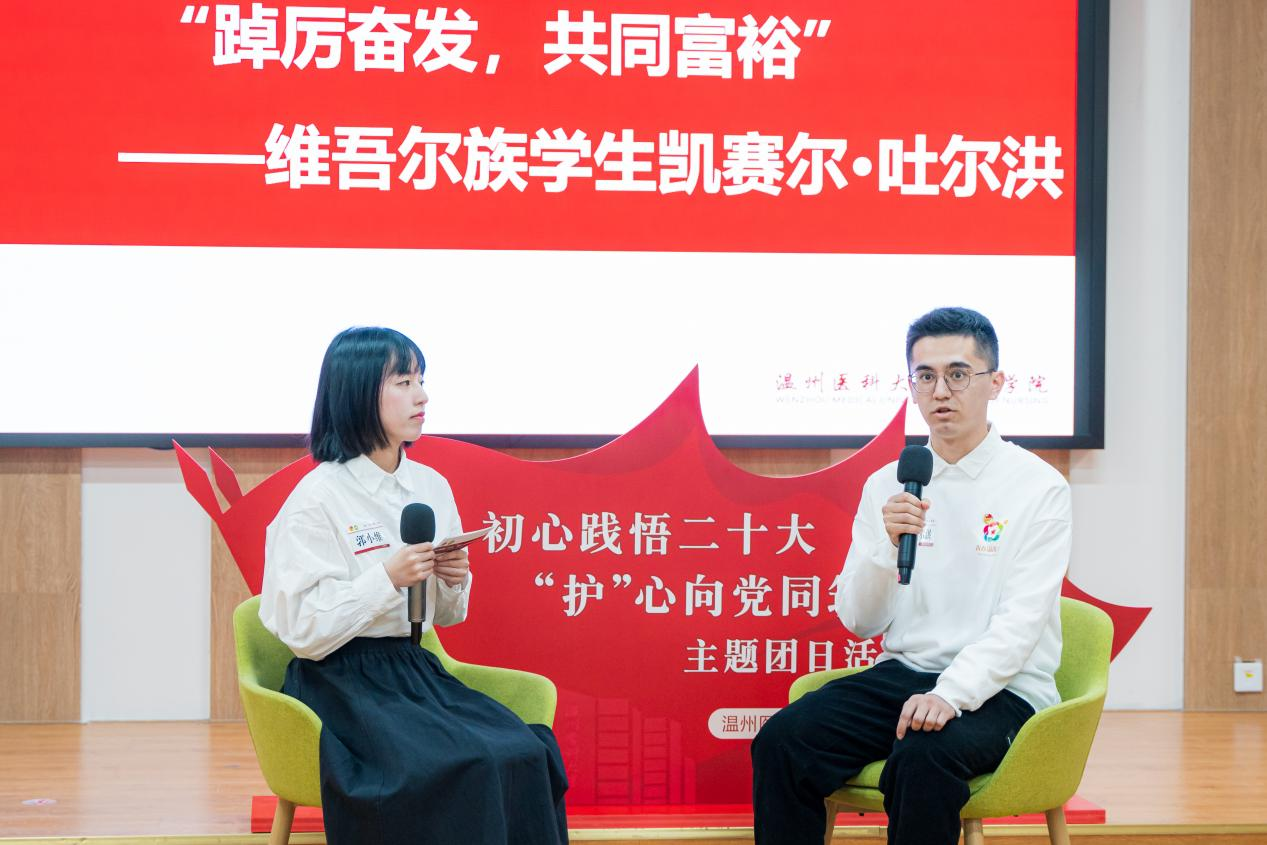 随后,三名拥有不同经历的团员代表分别围绕“党的二十大最有共鸣的一句话”进行分享。“作为一名护理学子,我们可以把运动会中坚韧不拔的品质和奋勇争先的精神渗透到往后的学习与工作中,努力成为一名专业,有情怀,有温度的卓越护生。”钱锦颖同学以“敢想敢为,善做善成”为主题,分享了她参加校运会的故事。“作为退役军人,我在部队里学会了不怕吃苦,听党话,跟党走。这就像一座灯塔,照亮着我前方的路。”退伍学生程雨杰围绕“人民至上,生命至上”讲述了他参军的经历。“我是共同富裕的见证者和受益者,在国家的大力扶持之下,才得以让更多像我一样的边疆少数民族的青年有更多更好求学深造的机会。”维吾尔族学生凯赛尔·吐尔洪以“踔厉奋发,共同富裕”为题分享了他的感悟。
