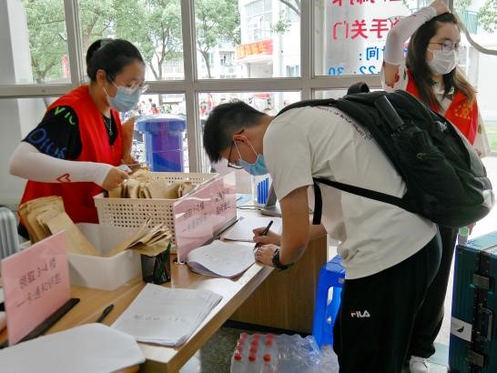 迎新队伍中同样闪耀的是一群身着红马甲的白鸽志愿者们,他们有条不紊地从新生手中接过行李,指引着新生进行扫码、测温、出示核酸检测报告等报道流程,现场忙而不乱,井然有序。新生们表示学长学姐们的热情帮助让他们印象深刻,从中感受到了大学生活的温暖,欢快的笑声掩盖了一天忙碌的疲惫。