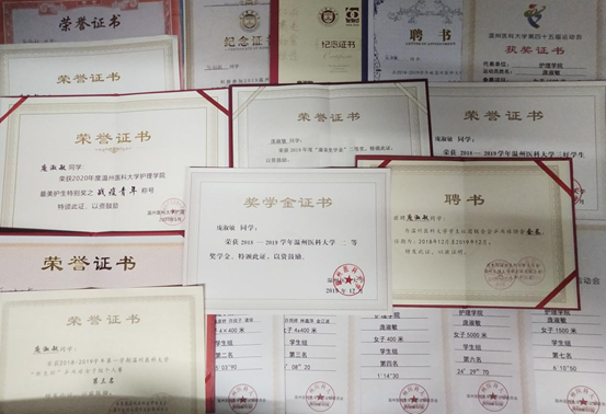就读本科四年,她累计获得省政府奖学金,校一等奖学金,校二等奖学金,校康泉二等奖学金,院白玉兰突出贡献奖;荣膺校级三好学生,校级优秀学生干部,院最美战“疫”青年,院“最美护生” 美之运动等称号;参与一项国家实用新型专利 ,是一项校级课题第一负责人;获得省第五届田径锦标赛体育道德风尚奖,校乒乓球新生杯女子单打第三名、新生杯团体亚军,校五分钟英语科研演讲赛二等奖、校职业生涯规划二等奖,校女子400米第四;400米接力第二;1500米第五;5000米第六,院800、1500、3000米第一等多项荣誉。她积极主动,将学习与校园生活一并于心,争做优秀温医追梦人。