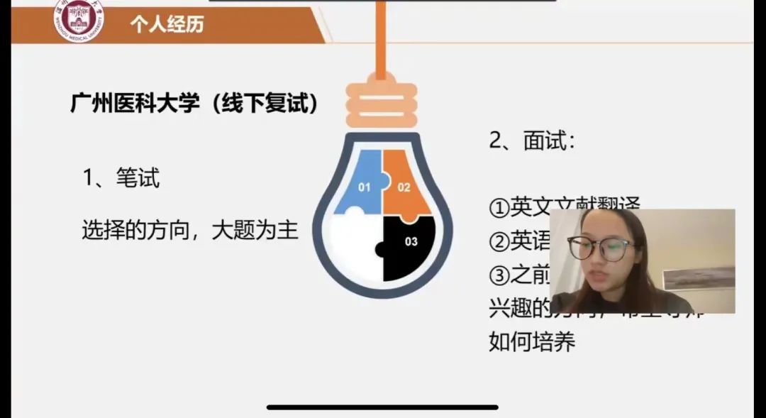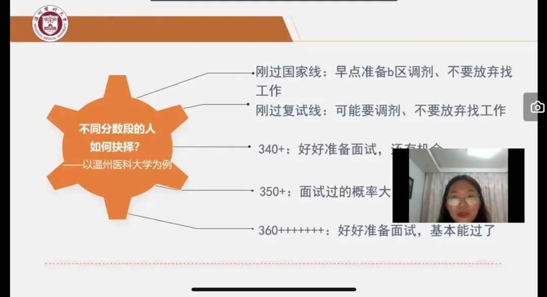 江小琼老师结合自己备考研究生和参与复试工作的经验,从“考生”和“面试官”两个不同的角色出发进行分享,并向同学们强调了英语口语和第一印象的重要性。针对临床问题,建议同学们要结合相关学科大胆提出自己的思考和见解。最后,江小琼老师希望同学们把握好机会,保持良好心态,争取一研为定!
