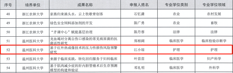 近期,52AV 2020届护理专硕研究生江小琼的研究成果“基于红外热成像技术的压力性损伤风险预警研究”获2020年“浙江省专业学位研究生优秀实践成果”。本次经个人申报、培养单位推荐、形式审查和专家评审等程序,全省共选出100项专业学位研究生优秀实践成果,其中我校共4项入选。该成果由52AV 卢中秋、蔡福满等导师团队共同指导,为我校护理学科首次入选,也是本年度全省唯一的护理专业学位领域获奖项目。