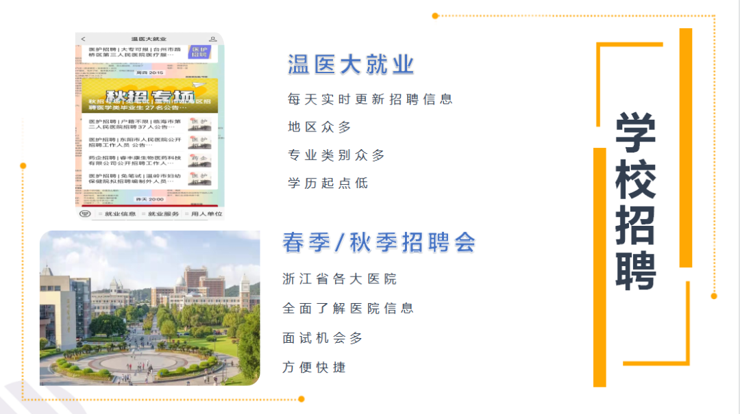 学校招聘。首先,关注“温医大就业”公众号,每天都实时更新招聘信息,具有地区众多、专业类别众多、学历起点低这些优点。其次,校园招聘会也是一个不错的平台,包括每年3月份的校园春季招聘会和每年11月份的校园秋季招聘会,毕业生可以与自己心仪的医院面对面沟通交流,获取招聘信息,部分单位会在招聘会当天举行笔试和面试,考试通过当天即可签约。最后,一些医院会联系学院推荐优秀学子,获得免笔试直接进入面试的资格。