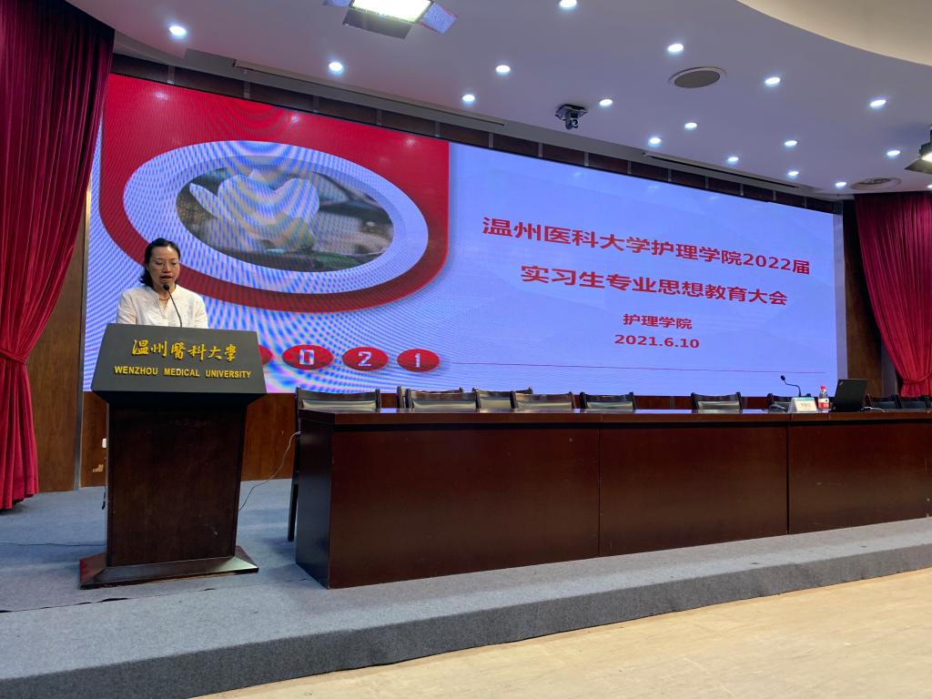 2021年6月10日,52AV 在旭光厅为即将开展实习工作的2022届学生举行实习前的专业思想教育大会,参加会议的有附属第二医院的护理部副主任刘一苇,附属第一医院新生儿科护士长陆宁洁,教学办、学工办相关老师等,800多名学生通过线上和线下方式参加会议。会议由教学办主任孙海琴主持。