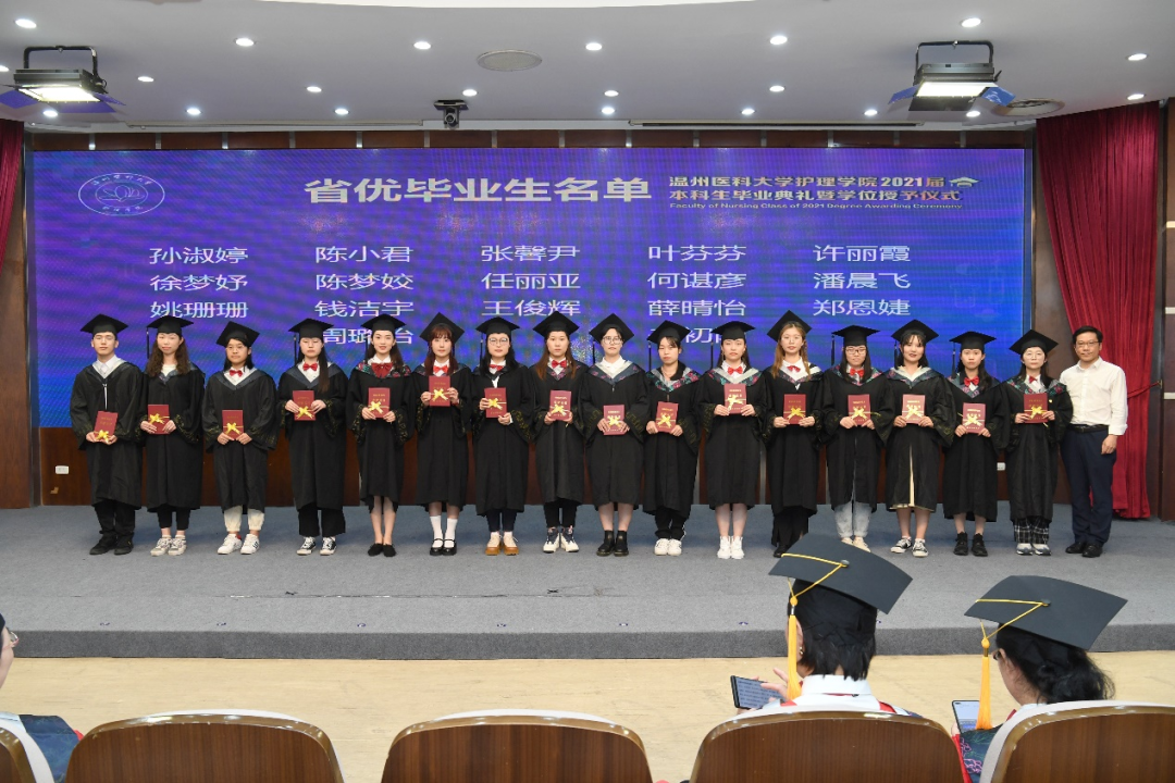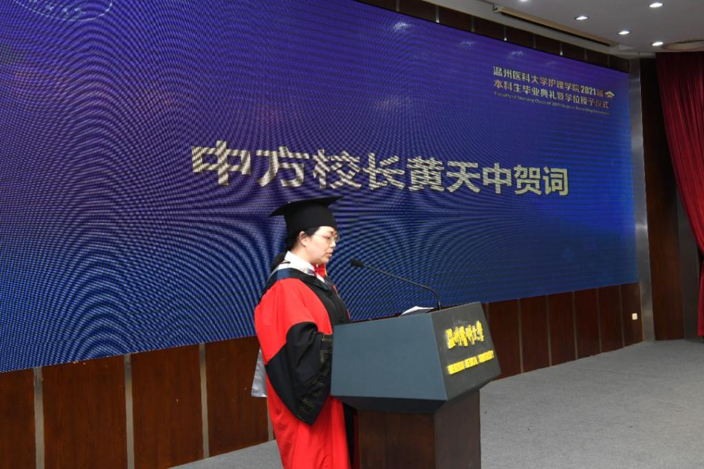 毕业生们穿上整齐的学士服,走上庄严的讲台。导师们为其拨穗,授予学位并颁发校友荣誉证书,肯定他们四年里的成长和努力。因为疫情,护理学(中外合作办学)专业的毕业生,收到远在他方的美方校长和中方校长发来的视频和书信,祝福同学们毕业快乐,前程似锦。毕业生代表林玲珑代表全体毕业生,表达了对母校的不舍和对老师的诚挚感谢,表示要担负起救死扶伤的使命与担当,将所学知识和技能服务社会、报效祖国。仪式现场还有家长远道而来,见证孩子们成长的时刻。“女儿是我的骄傲,非常感谢学校、学院培养了我的女儿。”毕业生陈韩的父亲激动地说。毕业礼成,2021届毕业生即将带着学院的祝福和嘱托扬帆起航!