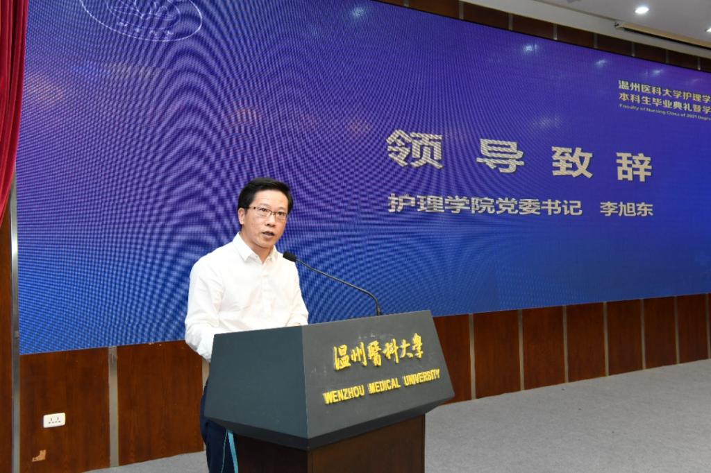 典礼在庄严的国歌声中拉开帷幕。学院党委李旭东书记致辞。他代表学院祝贺毕业生们圆满完成学业,向为学子成长成才倾注大量心血的师长和家长表示感谢。他高度肯定全体毕业生在过去四年付出的努力和取得的成绩。他向全体毕业生提出三点希望:一是希望同学们坚定理想信念。勉励同学们要认真学习党史,从中激发信仰、获得启发、汲取力量,树立为祖国为人民永久奋斗、赤诚奉献的坚定理想。二是希望同学们传承大爱精神。勉励同学们要承续抗疫中护理人大力彰显的家国情怀和职业精神,勇敢承担起救死扶伤的神圣职业使命。三是希望同学们追求自我卓越。勉励同学们要让优秀成为一种习惯,注重精神成长,强化精英意识,培养批判思维,加快迭代升级,努力做一名知性又优雅,自信有活力的新时代卓越护理人。