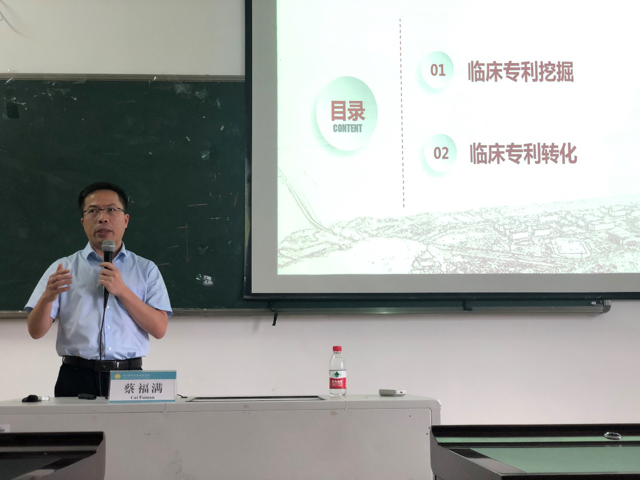 蔡福满就“临床专利挖掘及转化”作主题演讲,详细介绍了临床专利挖掘的内涵、途径以及专利转化的方法,并结合自身实例讲解了专利挖掘及转化的具体过程,讲解深入浅出,密切结合实际,为与会师生提供借鉴、开拓思路。