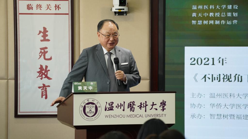 黄天中作题为“数字化、后疫情时代临终关怀教育与事业”的主旨演讲。他从“人为什么活着?”入手,引出孝亲感恩的文化、重视生命尊严的生命观,认为人生命的目的是有目的的生命。他指出人应该快乐的活着,把每一天都当作生命的最后一天来生活。黄教授还结合教育部《关于新冠疫情后加强全社会生死教育的提案》,指出应该将生死教育融入《不同视角下的临终关怀学》这门课程,引导学习者认识生命、尊重生命、爱护生命、理解生命的意义。