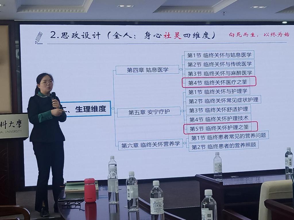 杨晔琴作题为“课程思政在临终关怀教学中的实施”的主题报告。她从“何为课程思政”“为何课程思政”“课程思政何为”三方面入手,认为课程思政是以课程为载体,学生的心理认知历程,形成积极的价值观、人生观和世界观,从而有利于国家管理的教育途径。她结合《不同视角下的临终关怀学》这门课程,从“向死而生、以终为始”的思政目标着手,通过思政设计,全程渗透“形而上和形而下”的思政元素,最后通过形成性评价来检验思政目标的完成情况。52AV 讲师邱贤云与徐天梦也分别做了“临终关怀志愿服务的组织与实施——以大学生为例”和“临终病人和家属关于临终问题的互动体验和需求”的主体报告,对于临终关怀志愿者建设与家庭建设分别提出了自己的见解。