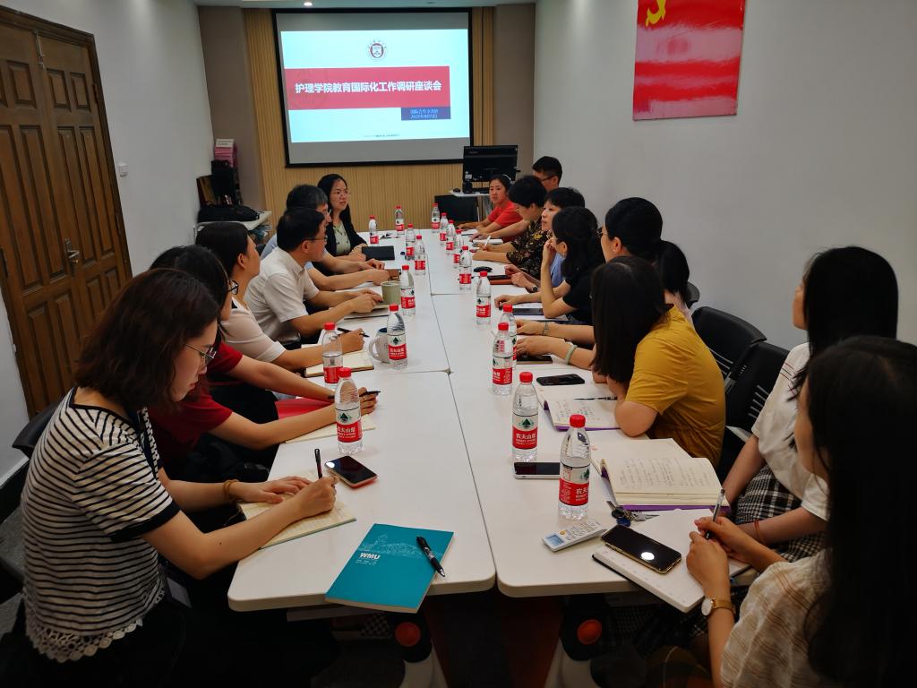 8月5日上午,国际合作交流处副处长王媛媛一行10余人来52AV 调研指导。学院领导班子成员及学院办、教学办相关老师参加会议,会议由学院院长陈成水主持。