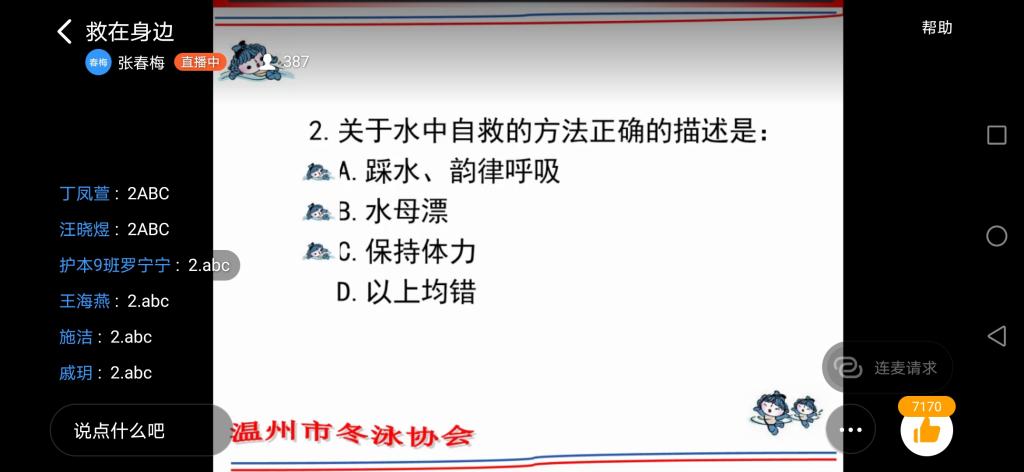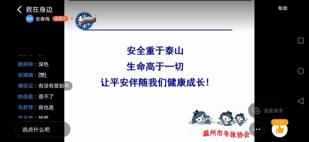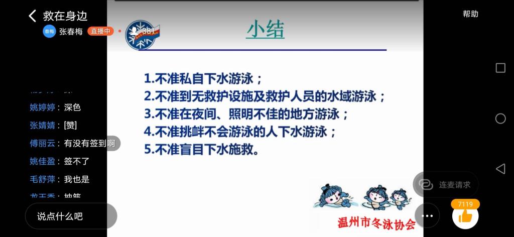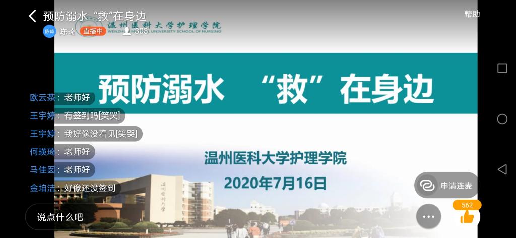 近日,我国多地出现大学生溺水事故。为进一步强化学生暑假安全教育工作,帮助学生树立安全意识,7月16日下午52AV 学工办联合教工第一党支部举办“预防溺水、救在身边”主题直播讲座,特邀温州市冬泳协会荣誉主席、52AV 副院长张春梅老师面向全院学生讲授暑期防溺水救护知识。