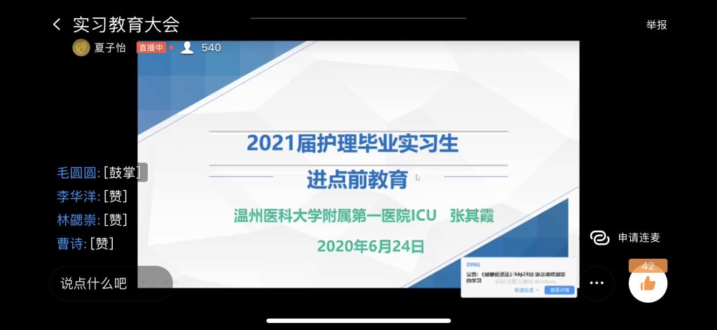 6月24日,52AV 通过视频会议的形式召开2021届毕业生下点前实习教育大会。学院副院长杨晔琴、附二院护理部副主任刘一苇、附一院ICU副护士长张其霞应邀出席此次会议,学院教学办主任孙海琴、教学办李斯佳,辅导员孔洁、王茹新以及即将下点实习的580位2021届毕业生共同参加了此次教育大会,会议由学院学工办主任张婧婧主持。