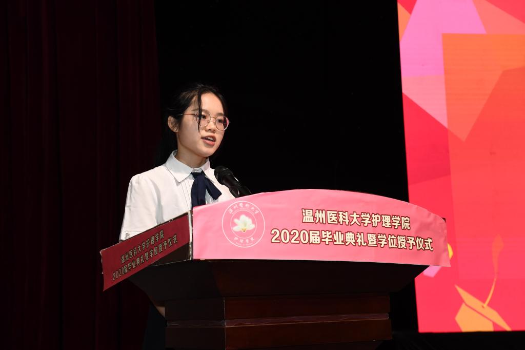 教师代表吴永琴希望毕业生们不忘初心、强健体魄、善于沟通、守时诚信,希望同学们成为眼中有光、胸中有志、腹中有才、心中有爱的健康守护神,做一名有温度的温医大护理人!毕业生代表严梦燕表达了对母校的不舍和对老师的诚挚感谢,表示要将所学知识和技能服务社会、报效祖国。