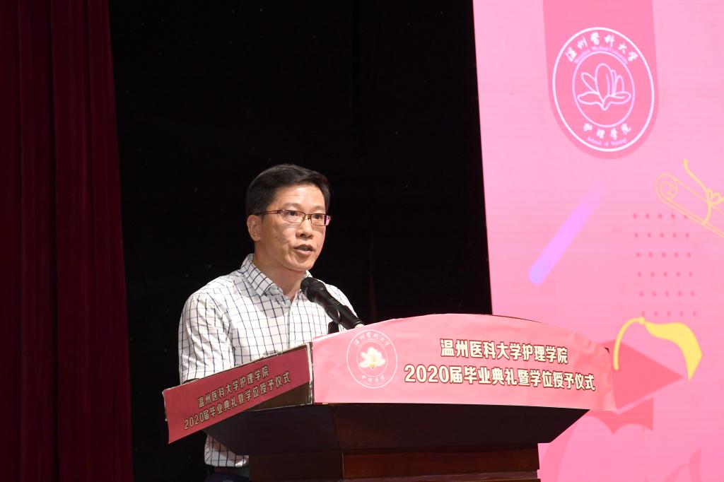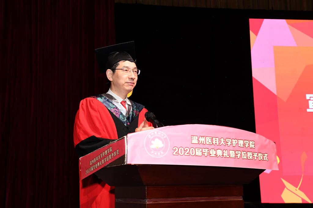 毕业典礼上,李旭东书记高度评价2020届毕业生,认为本届毕业生是追求真知、勤奋学习、锐意进取的一届,同时勉励同学们勇往直前、堪当大任,承续护理人的家国情怀和职业精神,真正成为救死扶伤的美丽天使;勉励同学们要让优秀成为习惯,努力成为展示温医精神的重要窗口,续写“有情怀有自信,能做事能创新”的温医篇章,用奉献筑起中国医疗卫生事业的未来;勉励同学们牢记母校的重托,牢记老师的教诲,始终心怀感恩,带着爱与责任前行,为祖国的大健康事业做出自己的贡献!最后,李书记指出“生命是一种缘”,深深的师生情缘,请同学们要好好珍惜。将来无论同学们正值春风得意居庙堂之高,还是等待厚积薄发处江湖之远,母校都欢迎同学们常回来看看。