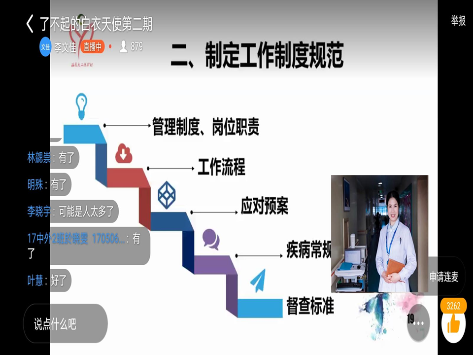18护专2班巩陈同学说:“这次直播课让我感触真的颇深,老师分享新冠疫情期间的收获和感动,不仅让我放下对医患关系的误解,也更坚信当初选择护理这条道路的决定是正确的!老师们分享他们在岗位上越变越好的经验,十分值得我借鉴和学习,尽管现在操作不熟,我们可以加速追逐着前辈的脚步,使自己越来越优秀!争取早日加入到白衣天使救死扶伤的队伍中去!”