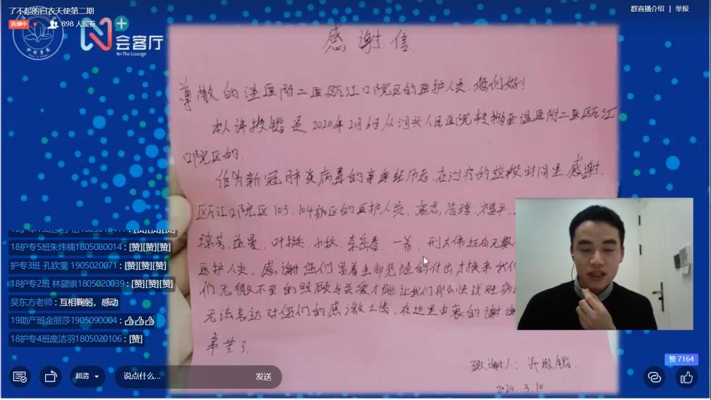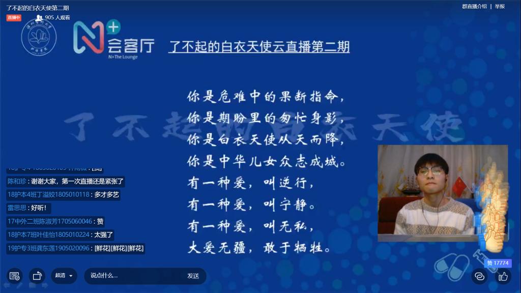 “你是危难中的果断指命,你是期盼里的匆忙身影,你是白衣天使从天而降,你是中华儿女众志成城”,直播接近尾声时,52AV 18护本8班的李同学代表全体学子倾情演唱歌曲《为爱逆行》献给四位老师。表达对参加抗疫的白衣天使们的崇高敬意,他们大爱无疆,勇于担当,是我们每一个中国人心中的盖世英雄!