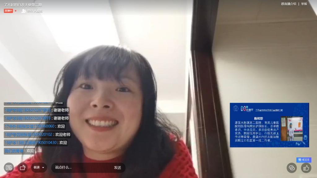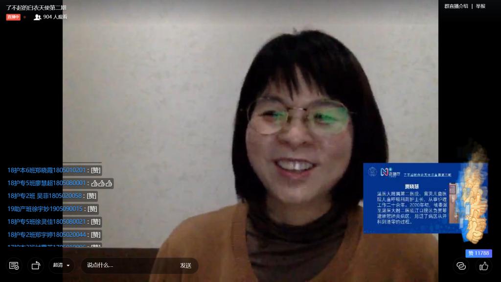4月9日52AV “了不起的白衣天使”直播间邀请到了奋战在温州“火神山医院”一线的四位白衣天使,与同学们分享战“疫”故事。他们作为温州“火神山医院”的抗疫担当,彰显温州力量,完美地诠释了南丁格尔精神,给52AV 900多名师生上了一堂生动而有意义的思政课,引导同学们奋发有为,听从党指挥,让爱国主义情怀深植于心。