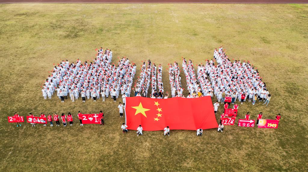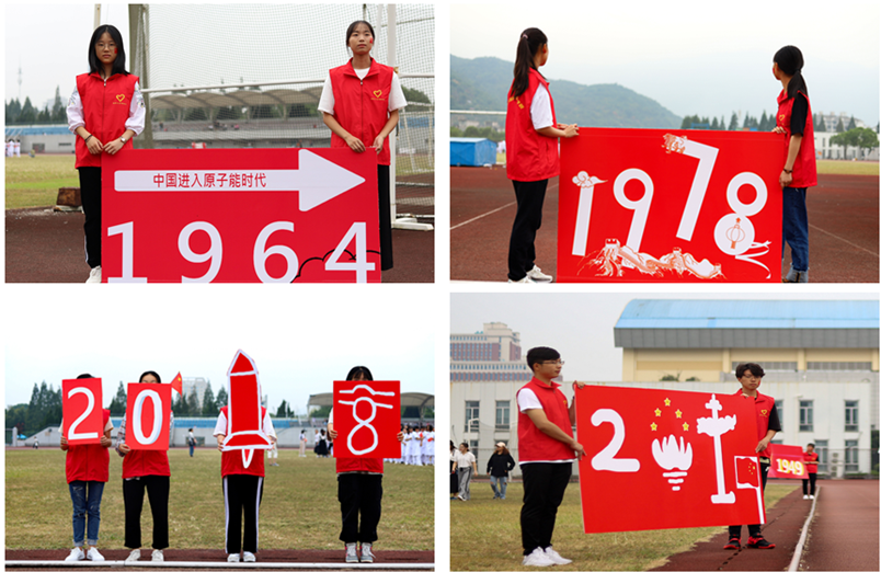奔跑中,环绕操场的是1964197219902001201020182019字牌,这些沉甸甸的字牌背后是数代人艰辛的付出,它们代表着中国一步步走向富强。这些字符在同学们心中跳跃,舞出新时代新中国的独特姿态。