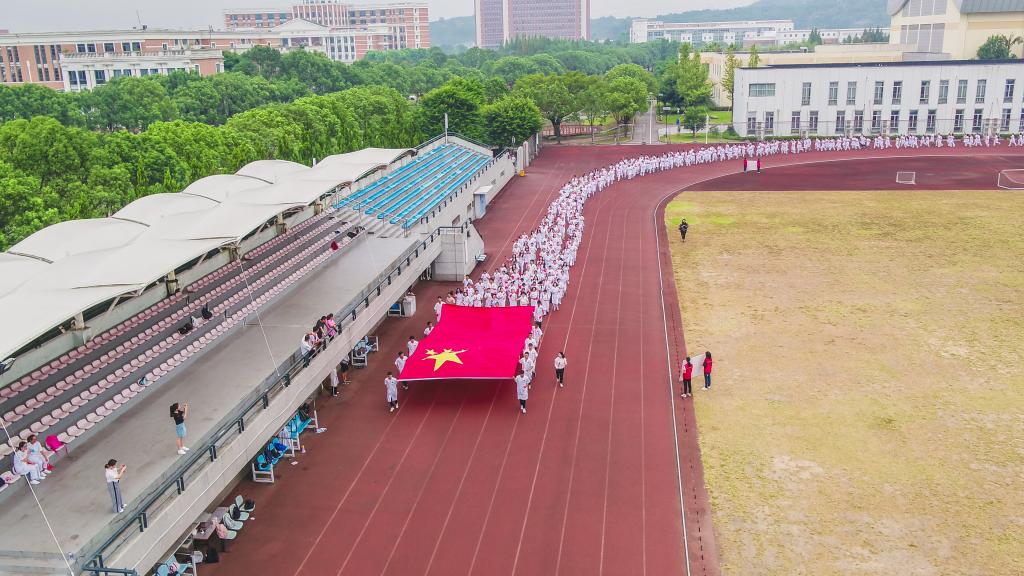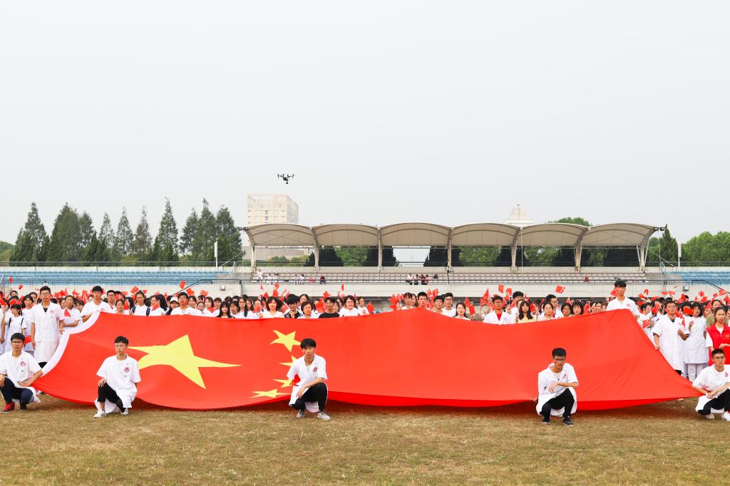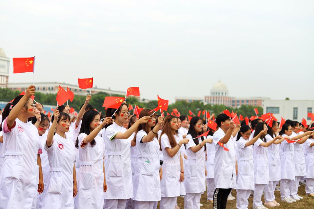 歌声持续着,在陈书记带领下,在五星红旗的引领下,新生整齐奔跑着,追随历史的步伐,紧跟中国前进的步履。灿烂的阳光洒在细嫩而有力的臂膀上,奔跑的白衣天使们挥动着手上的国旗,多么鲜艳的红色!他们共同撒下青春的汗水,奔跑着,奋斗着,梦想着。