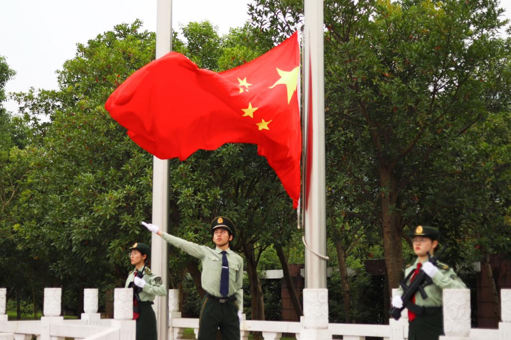 “我和我的祖国,一刻也不能分割,无论我走到哪里,都流出一首赞歌……”全体师生合唱《我和我的祖国》,歌声嘹亮、响彻天际。旗杆上,庄严的五星红旗迎风飘扬;师生们手中,小国旗们被高举头顶,扬起一片红色的海浪。每位师生脸上都洋溢着生为中华儿女的自豪和骄傲。