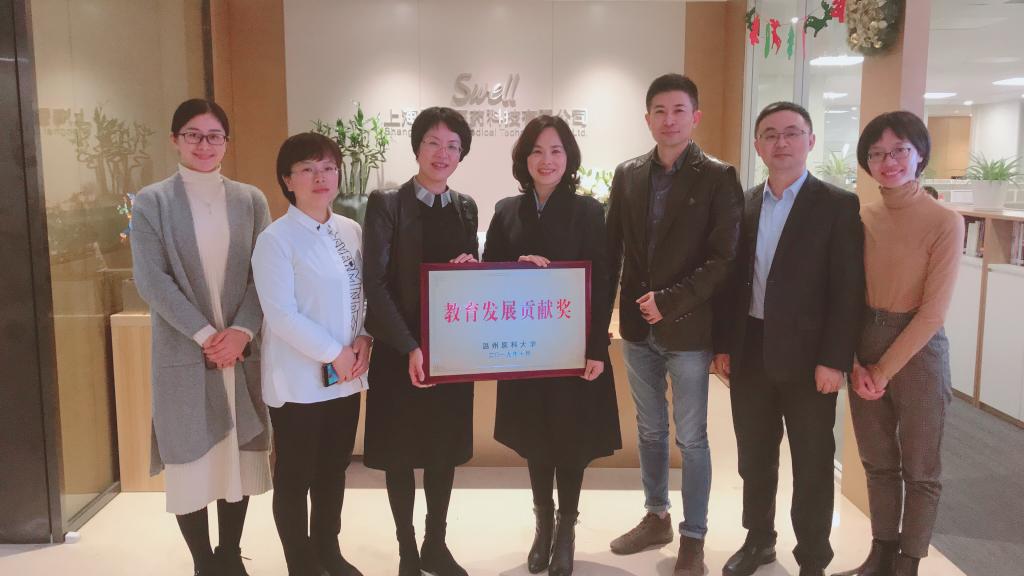 2019年12月17日,52AV 党委陈慧书记一行拜访上海雪伦医药科技有限公司总部,呈献学校为雪伦公司颁发的“教育发展贡献奖”奖牌,对雪伦公司五年如一日助力护理专业人才培养表达诚挚的感谢。