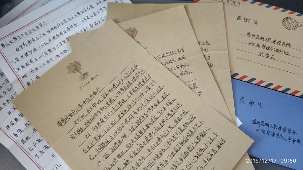 陈慧书记代表学校、学院对雪伦公司为护理专业人才培养的助力表达诚挚的感谢,并带去一份“特别”的礼物——获奖学子的感谢信。她们中有的已经毕业成为“白衣天使”,有的坚持继续深造。学子们在信中表达了对雪伦公司的感谢,也将自己目前的工作、学习状态进行了描述。“雪伦十佳奖学金的获得让我提高自己,开阔眼界,衷心地感谢贵公司,我也一定将这份爱传递下去,尽自己所能帮助他人。”雪伦十佳奖学金获得者严梦燕写道。“不忘初心,方得始终。少一些功利,多一些追求,凭借着对理想的坚持,我成功了。感谢雪伦助力我不断前行。”雪伦乐善奖学金获得者梁安东在信中这样说。