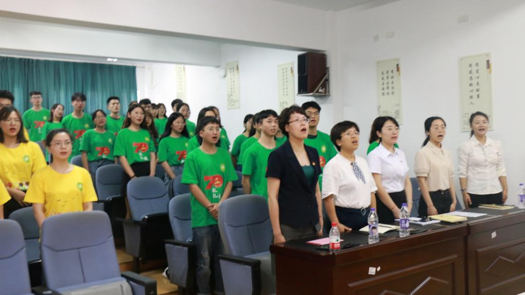 会议在学院团委书记金伟琼老师的主持之下有序地进行,开场齐唱国歌为会议增添了庄严的气氛。学院党委书记陈慧,党委副书记涂艳玲,学工办吴东方老师,王茹新老师,李萌老师等悉数到场指导。