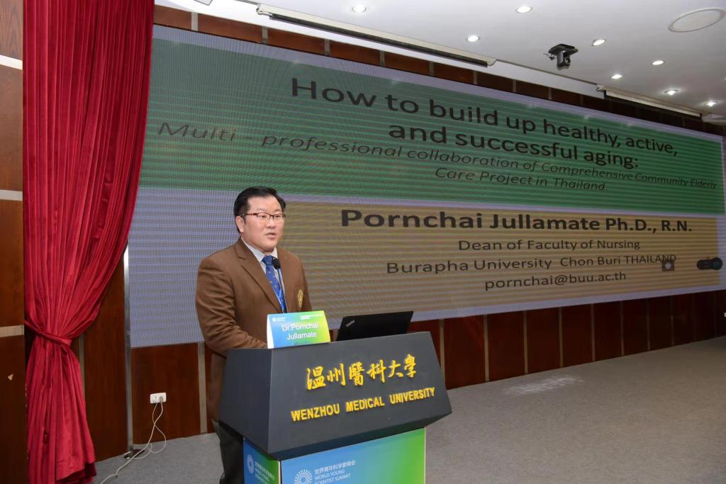 泰国东方大学52AV 院长Pornchai Jullamate 博士介绍了泰国多学科合作的综合社区老年照护项目。他分享了项目中临床各科医生、护士、康复治疗师、志愿者等协作,针对社区老年病人进行饮食护理、认知功能训练、康复锻炼、口腔肌肉训练等,在社区最大程度地促进解决老年病人的康复问题的研究成果,提出护理团队还需要对社区病人进行家访,评估多学科护理服务的效果。