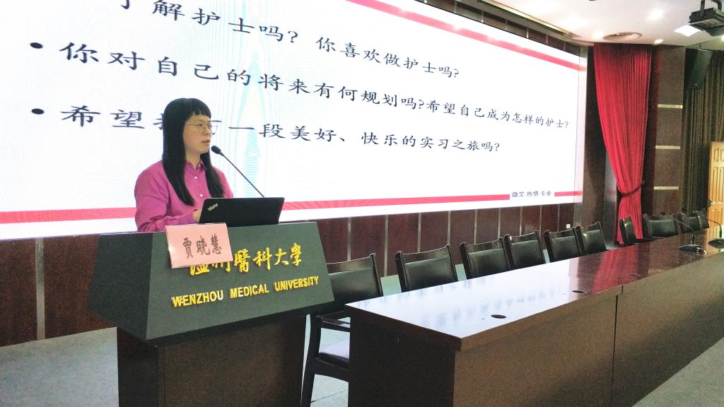 贾晓慧老师以《快乐实习,你准备好了吗?》为题,与同学们分享了中国护理事业健康可持续发展路径,鼓励同学们树立护理职业目标,提升幸福感。贾老师还从态度端正、礼仪大方、沟通良好、行为规范四个方面对实习生提出了要求和希望。