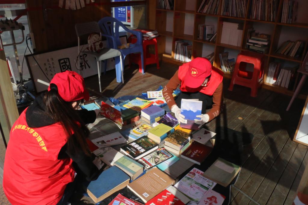 除此之外,白鸽青年志愿者服务社的志愿者们也对BRT中央书巢的书籍进行了整理、消毒。面对一堆堆市民捐赠的图书,志愿者们有条不紊地进行归类,文学类、体育健康类、休闲娱乐类……经过志愿者们几个小时的努力,原本杂乱无章的书籍变得整整齐齐,志愿者们的手套从米色变成了灰色,头发也变得凌乱,但是处在书堆里的她们却如此明亮动人。将书籍归类整理好之后,志愿者们马上对一些年代较久远的书籍消毒,让它们能更好地发挥其存在的价值。活动接近尾声时,在道德广场进行志愿服务的奶奶送来了热腾腾的饺子,饺子的香味和书的香气在阳光中谱成了一曲动人心弦的乐曲。