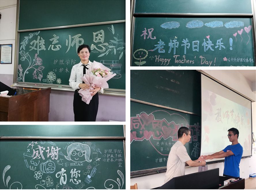 教师节前一天,学生们用粉笔一笔一画描绘出与老师的温馨时光,每一块板报上都传递着同学们对老师美好的祝福。