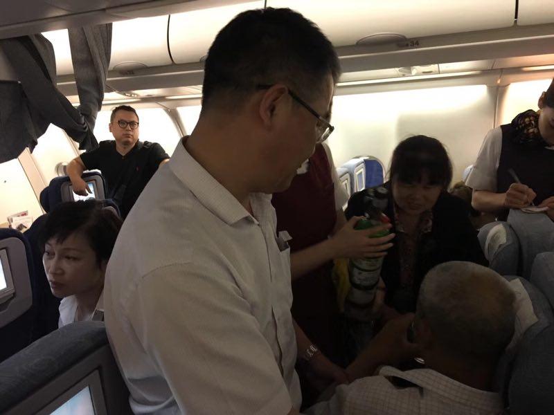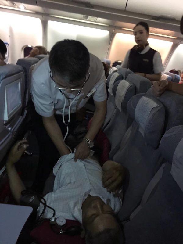 原来,6月9日晚上8点多,在北京飞往温州的国航CA1539航班上,一名乘客突发呼吸心脏骤停,急需救助。恰好,院长卢中秋等几位医护人员也乘坐了该趟航班,在听到广播后,他们迅速赶到该名乘客身边,卢院长随即对他进行胸外按摩,心肺复苏。经过紧急抢救,患者脉搏逐渐恢复,症状有所缓解,但考虑到情况不太乐观,卢院长向乘务员建议立刻返航。最终航班返航将该乘客送回地面救治。而等他们再飞回温州已经是凌晨两点多了。